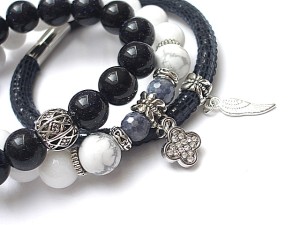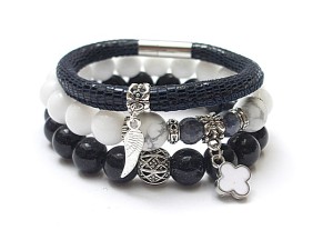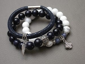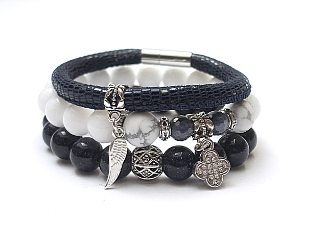 PROJEKT AUTORSKI. Własność KI-Ka. KOPIOWANIE - ZABRONIONE . Komplet trzech bransoletek wykonanych z naturalnych kamieni - szafiry fasetowane [6mm], jadeity [10mm], howlity matowe [10mm], noc kairu [10mm], rzemienia z naturalnej skórki cielęcej oraz elementów metalowych w kolorze srebra. Pasują na nadgarstek 16 - 17cm . Biżuteria ozdobnie zapakowana