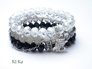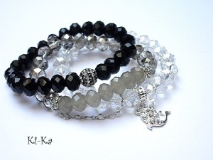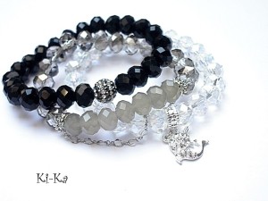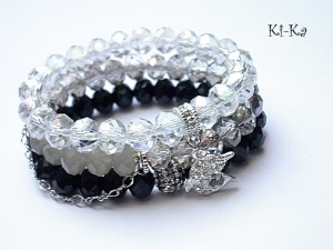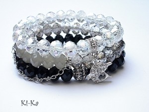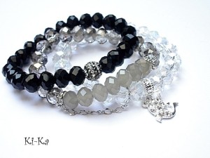 Komplet trzech bransoletek wykonanych z fasetowanych oponek kryształków [10mm] oraz elementów w kolorze srebrnym wysadzanych cyrkoniami. Bransoletki pasują na nadgarstek 15 - 16,5cm. Biżuteria ozdobnie zapakowana.