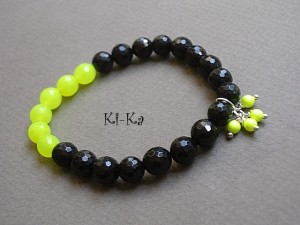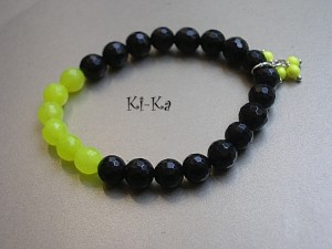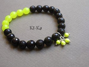 Bransoletka wykonana z naturalnych minerałów-jadeity w kolorze neonowym, onyks [8mm], perełek Swarovskiego oraz elementów w kolorze srebrnym. Bransoletka na gumce silikonowej. Pasuje na nadgarstek 15-16,5cm. Bransoleta może stanowić komplet z innymi bransoletkami - przykładowe zdjęcia.