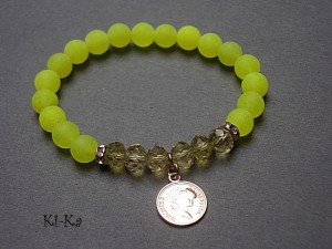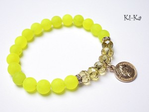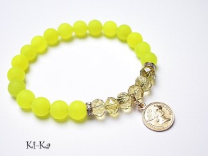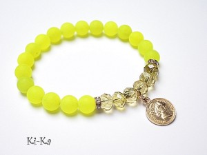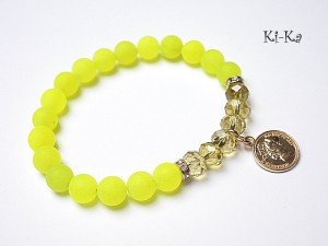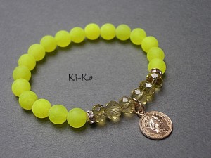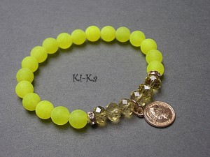 Bransoletka wykonana z kamieni naturalnych -matowe jadeity [8mm] kryształki [10mm] ,przekładki wysadzane kryształkami oraz elementów w kolorze bladego złota. Bransoletka na gumce silikonowej. Pasuje na nadgarstek 16-17cm. Biżuteria ozdobnie zapakowana.
