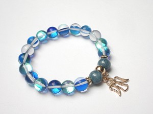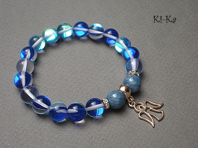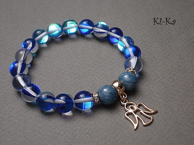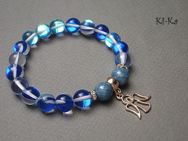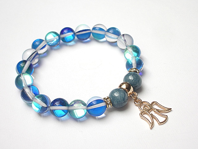 Bransoletka wykonana z naturalnych kamieni - jadeity [10mm] ,kwarc z efektem AB - kamienie mienią się w zależności od kąta padania światła [10mm] oraz z elementów w kolorze tzw. różowego złota. Bransoletka na gumce silikonowej. Będzie pasowała na nadgarstek 16-17cm.cm. Biżuteria ozdobnie zapakowana