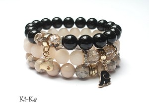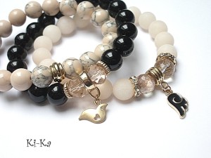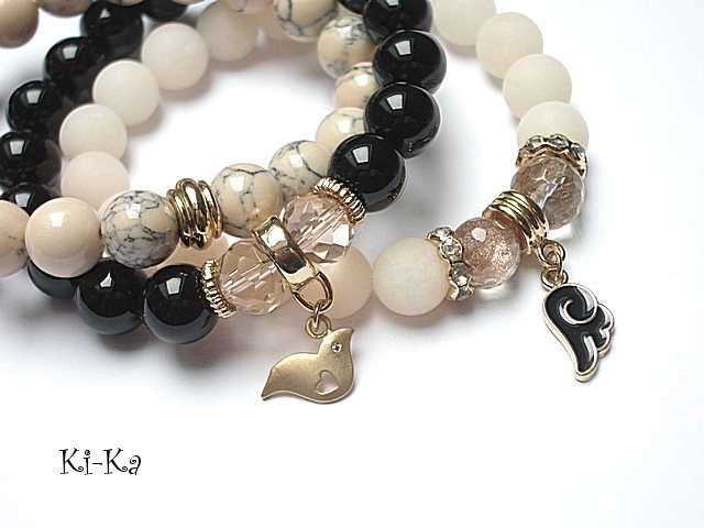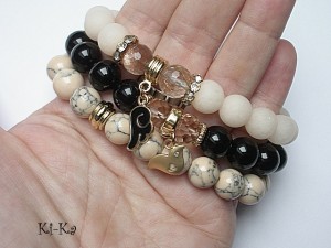 PROJEKT AUTORSKI. WŁASNOŚĆ KI-KA. KOPIOWANIE ZABRONIONE. Komplet trzech bransoletek wykonanych z naturalnych kamieni - matowe jadeity [10mm] ,howlity [10mm] ,fasetowane kuleczki kwarców ze złotymi drobinkami [10mm], onyks [10mm], kryształków fasetowanych [10 x 8mm] oraz elementów metalowych w kolorze tzw.różowego złota.Bransoletki pasują na nadgarstek 16-17cm. Biżuteria ozdobnie zapakowana