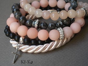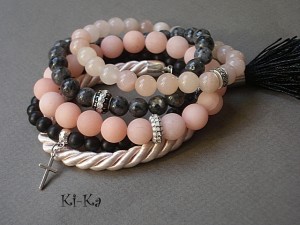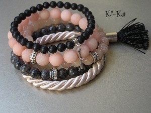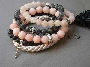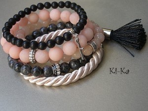 Komplet pięciu bransoletek wykonany z naturalnych minerałów: jadeit matowy [10mm], jadeit [8mm], larvikit [8mm], black stone [6mm], satynowego sznurka z chwostem oraz z elementów w kolorze srebra. Bransoletki z minerałów na gumce silikonowej. Bransoletki będą pasowały na nadgarstek 15,5-16,5cm. Biżuteria ozdobnie zapakowana