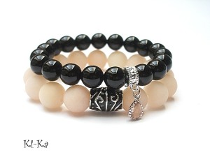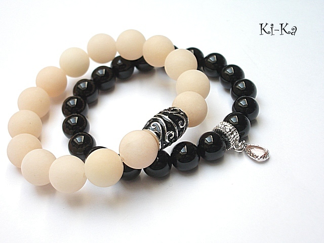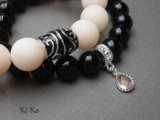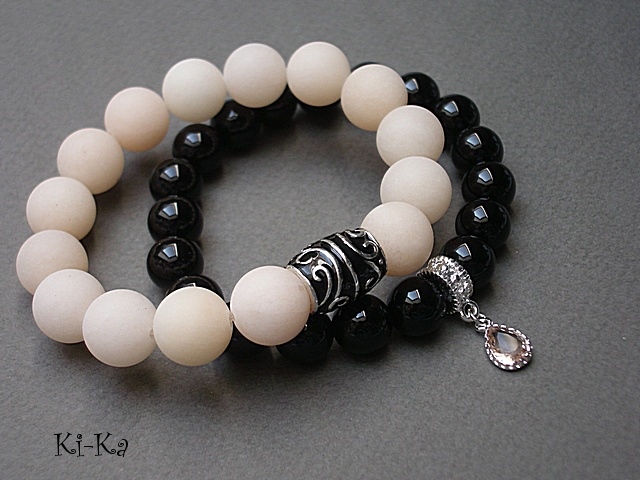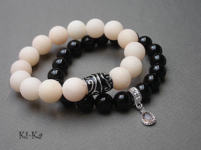 PROJEKT AUTORSKI. WŁASNOŚĆ KI-KA. KOPIOWANIE ZABRONIONE. Komplet dwóch bransoletek wykonanych z kul naturalnych kamieni - matowe jadeity [12mm] ,onyksy [10mm] fasetowane jadeity efektownej zawieszki szklanej w okuciu oraz elementów metalowych w kolorze srebrnym. Bransoletki pasują na nadgarstek 16-17cm. Biżuteria ozdobnie zapakowana