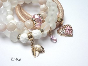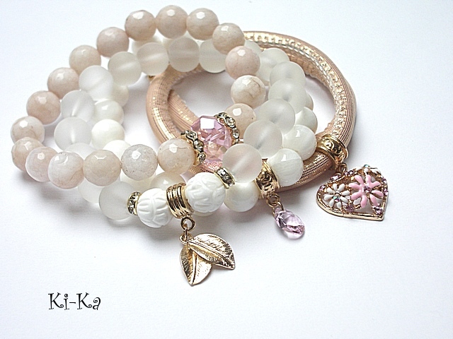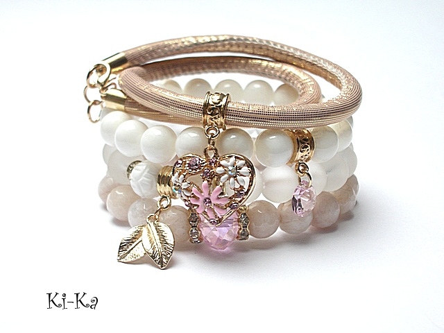 PROJEKT AUTORSKI. WŁASNOŚĆ KI-KA. KOPIOWANIE ZABRONIONE. Komplet czterech bransoletek wykonanych z naturalnych kamieni - jadeity fasetowane [10mm], muszla [10mm], muszla rzeźbiona [10mm] , matowego szkła [10mm] , przywieszki z kryształkiem Swarovskiego, efektownej zawieszki wysadzanej kryształkami, kryształka fasetowanego [14 x 12nn], rzemienia z ekologicznej skórki oraz elementów metalowych w kolorze różowego złota. Bransoletki z kamieni i szkła na gumce silikonowej. Pasują na nadgarstek16-17cm. W przypadku zmiany rozmiaru bransoletek prosimy o wcześniejszy kontakt. Biżuteria ozdobnie zapakowana