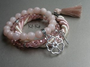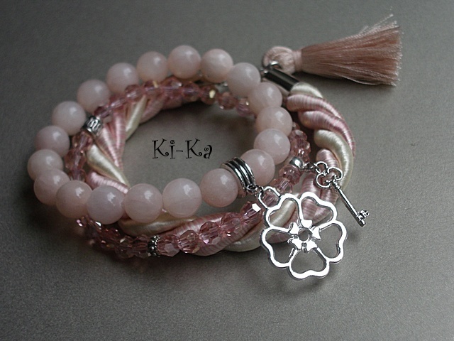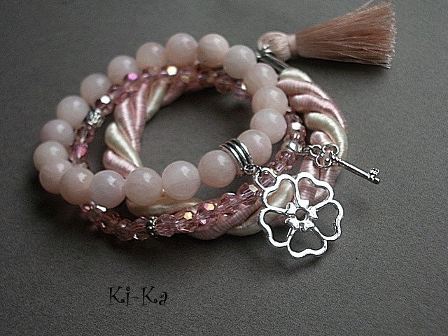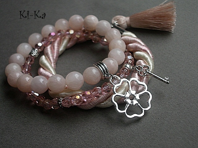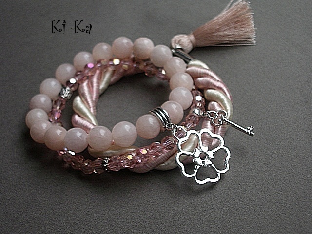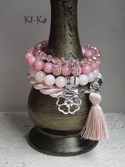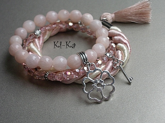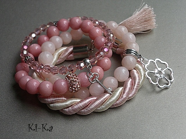 Komplet trzech bransoletek wykonanych z naturalnych kamieni [jadeity 10mm], kryształków [szkło bardzo dobrej jakości], skręcanej liny, satynowego chwostu oraz elementów metalowych w srebrnym kolorze Bransoletki pasują na nadgarstek 15 - 16,5cm. Biżuteria ozdobnie zapakowana. Bransoletki mogą stanowić komplet z innymi modelami - przykładowe zdjęcia. Cena dotyczy trzech bransoletek ze zdjęcia pierwszego..