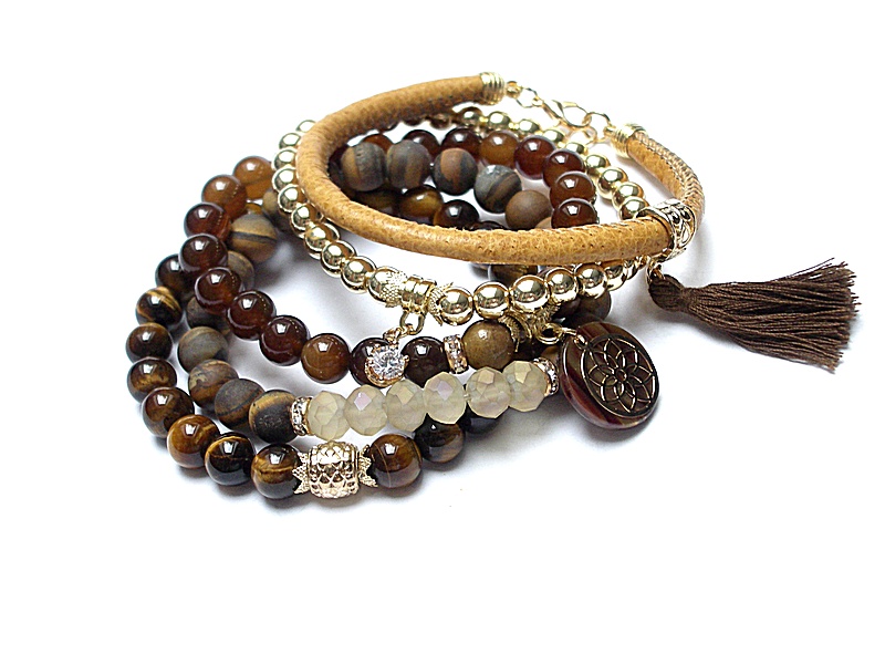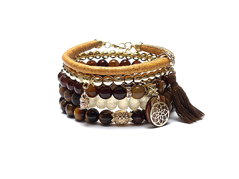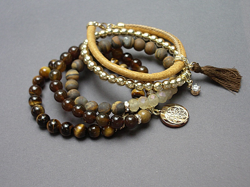 Komplet pięciu bransoletek wykonanych z naturalnych kamieni: tygrysie oko matowe [8mm], tygrysie oko [8mm], agaty [8mm], hematyt [6mm], kryształki [8mm], zawieszki z żywicy, zawieszki wysadzanej cyrkoniami, chwosta, rzemienia ze skórki naturalnej oraz elementów metalowych w kolorze złota. Bransoletki pasują na nadgarstek 16-17cm. Biżuteria ozdobnie zapakowana