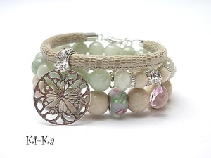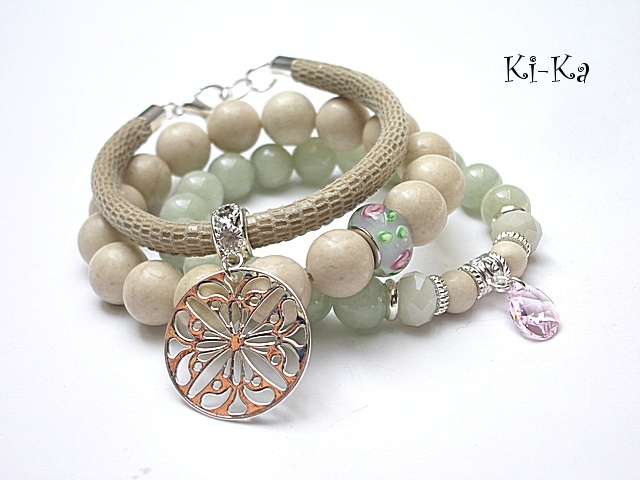 PROJEKT AUTORSKI. WŁASNOŚĆ KI-KA. KOPIOWANIE ZABRONIONE. Komplet trzech bransoletek wykonany z kamieni naturalnych -marmur [12mm] ,jadeity [10mm] ,kryształki [10mm i 8mm] ,zawieszki z kryształka Swarovskiego , rzemienia szytego ze skórki naturalnej [6mm] oraz elementów metalowych w kolorze srebra. Pasują na nadgarstek 16-17cm. Bransoletki z kamieni na gumce silikonowej. Biżuteria ozdobnie zapakowana.