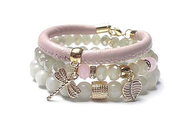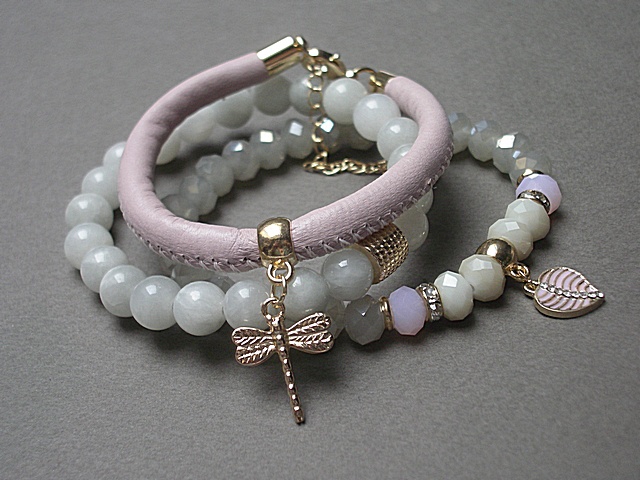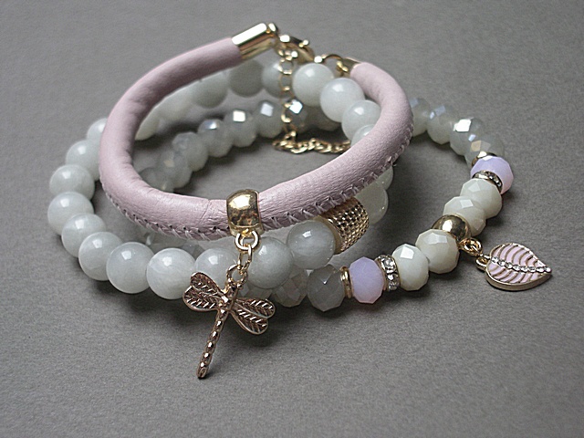 Komplet trzech bransoletek wykonanych z jadeitów [8mm], kryształków [8mm], rzemienia z naturalnej skórki [śr. 7mm] oraz elementów metalowych w kolorze złota. Bransoletki z kamieni i kryształków na gumce silikonowej. Pasują na nadgarstek 15-16cm. Biżuteria ozdobnie zapakowana.