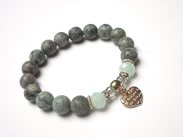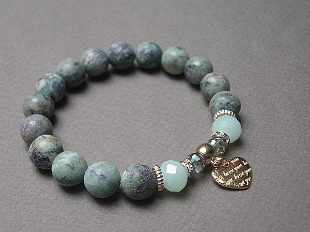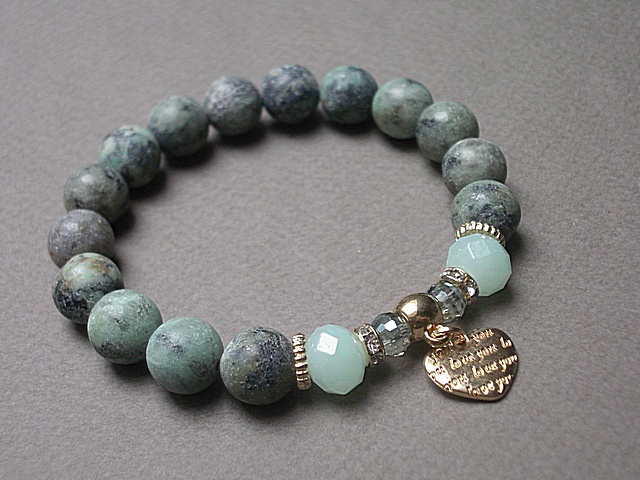 Bransoletka wykonana z kamieni naturalnych - surowe turkusy afrykańskie [10mm], kryształki [10mm i 8mm] oraz elementów metalowych w kolorze złota. Bransoletka na gumce silikonowej. Pasuje na nadgarstek 16-17cm. Biżuteria ozdobnie zapakowana.