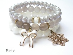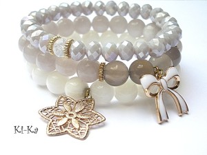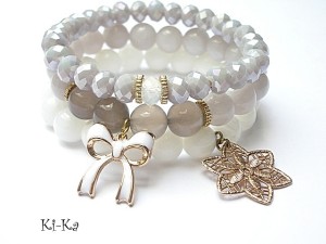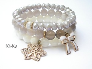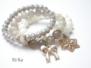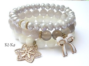 Komplet trzech bransoletek wykonany z kamieni naturalnych -jadeity [10mm] , szare agaty transaparentne [10mm] oraz elementów w kolorze złotym . Pasują na nadgarstek 15 -16,5cm. Bransoletki z kamieni na gumce silikonowej. Biżuteria ozdobnie zapakowana