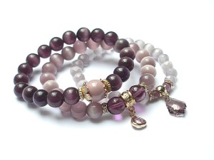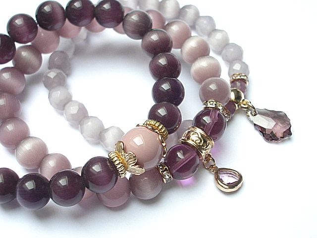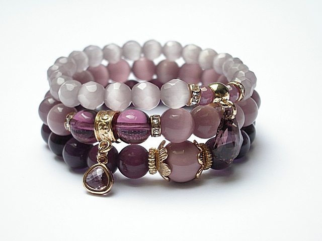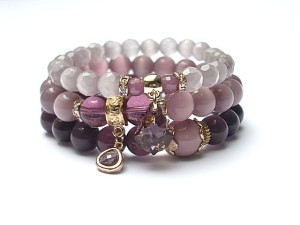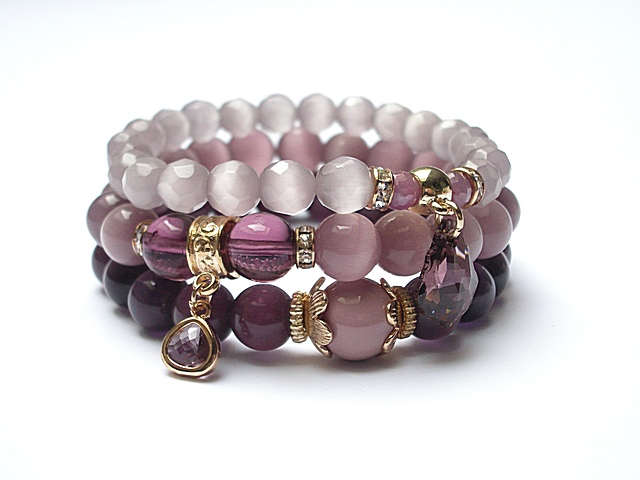 PROJEKT AUTORSKI. WSZELKIE INNE PODOBNE MODELE TO KOPIE NARUSZAJĄCE PRAWA AUTORSKIE. Komplet trzech bransoletek wykonanych z naturalnych kamieni: jadeity [12mm], uleksyt [10mm], uleksyt fasetowany [8mm], rubiny fasetowane [6mm], szkła [10mm], efektownej przywieszki ze szkła, przywieszki z kryształkiem Swarovskiego w kształcie kropli barokowej oraz elementów metalowych w kolorze tzw. różowego złota. Bransoletki pasują na nadgarstek 16 - 17cm. Biżuteria ozdobnie zapakowana