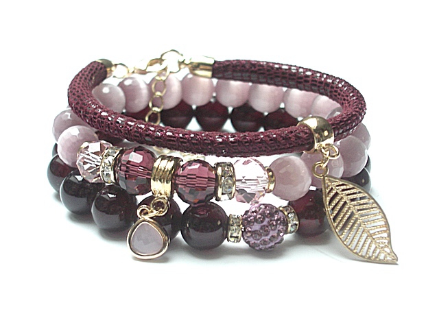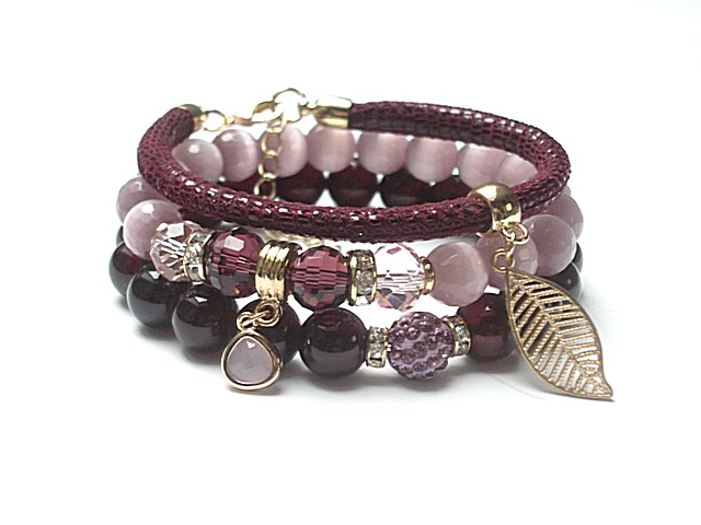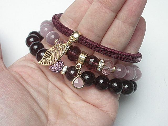 Komplet trzech bransoletek wykonanych z naturalnych kamieni: marmur [10mm] ,uleksyty fasetowane [10mm] kryształki [10mm] , kuleczki shamballa wysadzanej kryształkami swarovskiego [10m] ,przywieszki w okuciu , skórzanego rzemienia z naturalnej skórki [śr.5mm] oraz elementów metalowych w kolorze tzw. różowego złota. Bransoletki pasują na nadgarstek 16 - 17cm. Biżuteria ozdobnie zapakowana