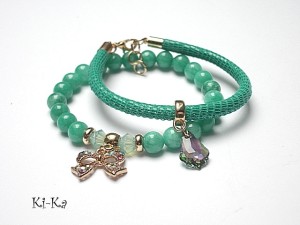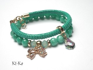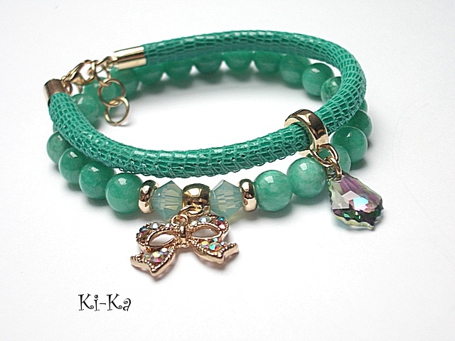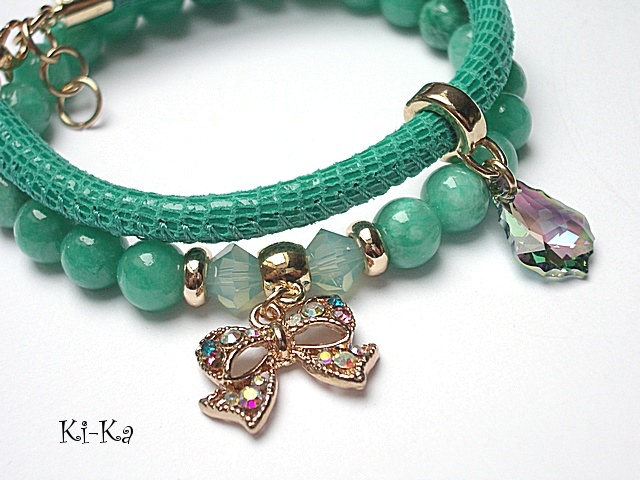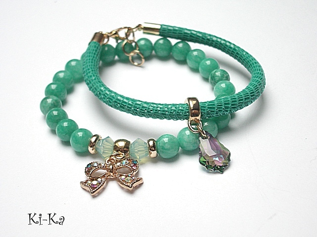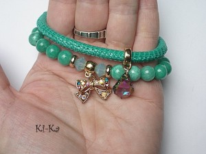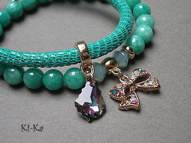 PROJEKT AUTORSKI. WŁASNOŚĆ KI-KA. KOPIOWANIE ZABRONIONE. Komplet dwóch bransoletek wykonanych z naturalnych kamieni - marmur [8mm] , rzemienia z naturalnej, miękkiej, cielęcej skóry, ekskluzywnej przywieszki wysadzanej cyrkoniami, przywieszki z kryształkiem Swarovskiego w kształcie kropli barokowej, kryształków Swarovskiego bicone [8mm] oraz elementów metalowych w kolorze tzw. różowego złota. Bransoletki pasują na nadgarstek 16-17cm . Biżuteria ozdobnie zapakowana