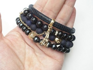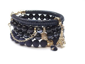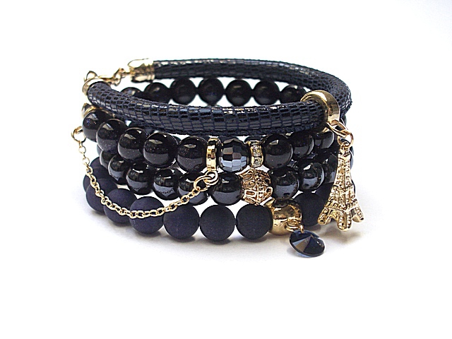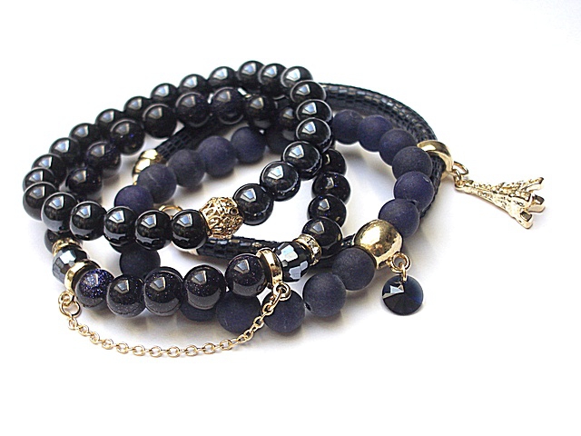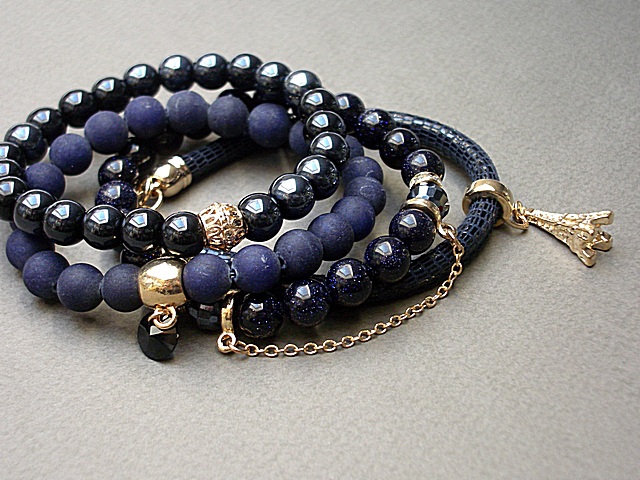 PROJEKTY AUTORSKIE. WŁASNOŚĆ KI-KA. KOPIOWANIE ZABRONIONE. Komplet czterech bransoletek wykonanych z naturalnych kamieni: jadeity matowe [8mm], noc kairu [8mm], szklanych, opalizujących kuleczek [8mm], kryształków fasetowanych [8mm], zawieszki - kryształka Swarovskiego [Rivoli 8mm], rzemienia z naturalnej, miękkiej skóry koziej oraz elementów metalowych w kolorze złota. Pasują na nadgarstek 16-17cm. Biżuteria ozdobnie zapakowana.