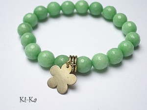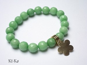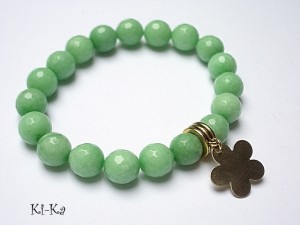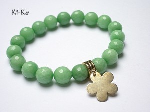 Bransoletka wykonana z kamieni naturalnych - fasetowane jadeity [10mm], przywieszki z mosiądzu [nie ulega ścieraniu] oraz elementów w kolorze złotym. Bransoletka na gumce silikonowej. Pasuje na nadgarstek 15-16,5cm. Biżuteria ozdobnie zapakowana.