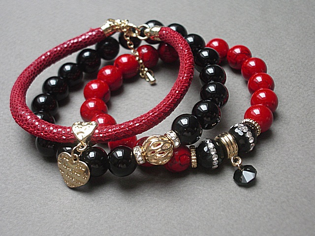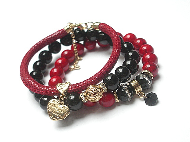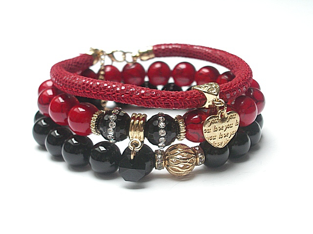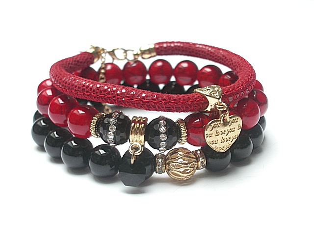 PROJEKT AUTORSKI. WŁASNOŚĆ KI-KA. KOPIOWANIE ZABRONIONE. Komplet trzech bransoletek wykonanych z naturalnych kamieni: onyks [10mm], marmur [10mm], agatów wysadzanych cyrkoniami [10mm], rzemienia z naturalnej skóry, zawieszki z kryształka Swarovskiego oraz elementów metalowych w kolorze różowego złota. Bransoletki pasują na nadgarstek 16 - 17cm. Biżuteria ozdobnie zapakowana