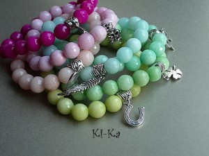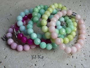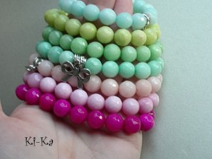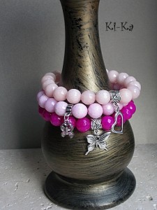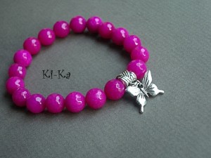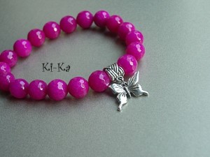 Bransoletka wykonana z fasetowanych kuleczek jadeitów w kolorze fuksji [10mm] oraz elementów w kolorze srebra. Bransoletka na gumce silikonowej. Pasuje na nadgarstek 15,5 - 16,5cm. Biżuteria ozdobnie zapakowana. Bransoletka może stanowić komplet z innymi bransoletkami - przykładowe zdjęcia. Cena dotyczy bransoletki w kolorze fuksji [z motylkiem].