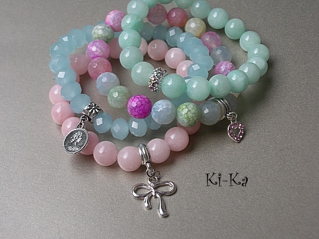 Bransoletka wykonana z naturalnych minerałów [jadeity 10mm] oraz elementów w kolorze srebra. Pasuje na nadgarstek 15,5- 16,5cm. Bransoletka na gumce silikonowej. Biżuteria ozdobnie zapakowana. Bransoletka może stanowić komplet z innymi modelami - przykładowe zdjęcia