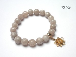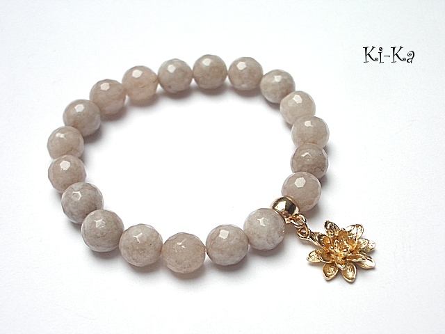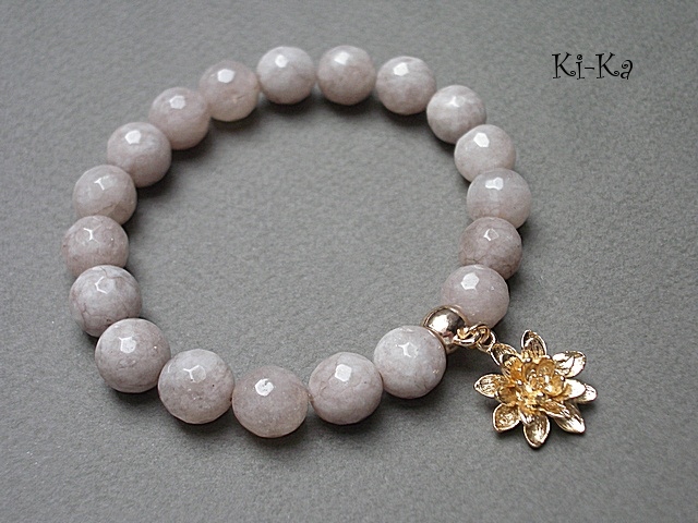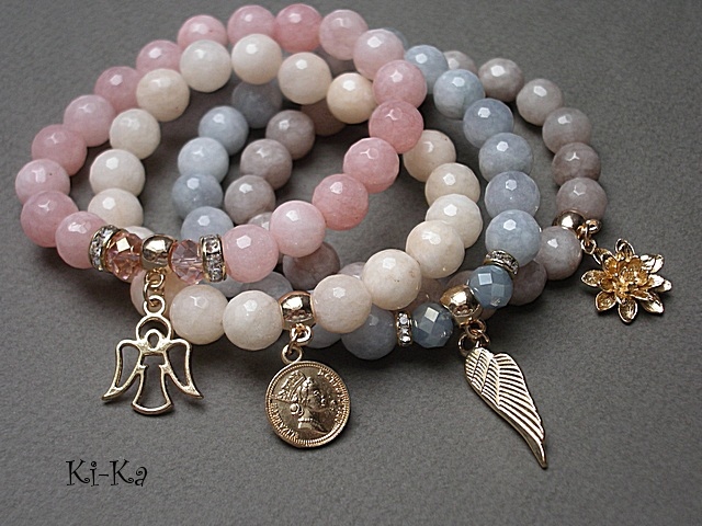 Bransoletka wykonana z fasetowanych jadeitów [10mm] oraz elementów metalowych w kolorze różowego złota.Zdjęcie pierwsze przedstawia przykładowa kombinację - cena dotyczy bransoletki z beżowych kamieni ze zdjęć 2, 3 i 4. Bransoletka pasuje na nadgarstek 16,5-17,5cm. Biżuteria ozdobnie zapakowana.