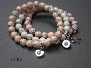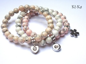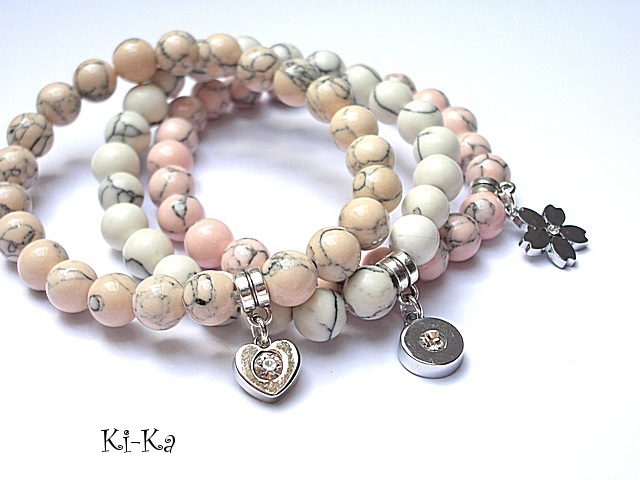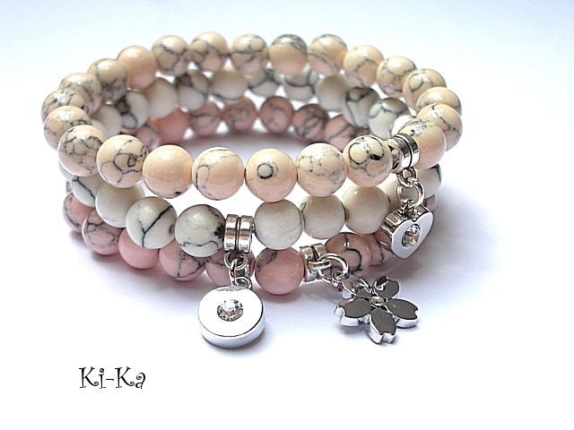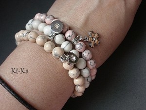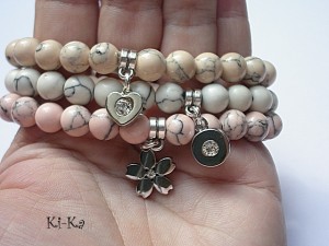 PROJEKT AUTORSKI .Komplet trzech bransoletek wykonany z kamieni naturalnych - howlity [10mm] oraz elementów w kolorze srebrnym. Pasują na nadgarstek 15,5-17cm. Bransoletki na gumce silikonowej. Biżuteria ozdobnie zapakowana.