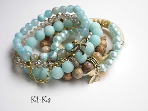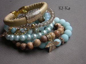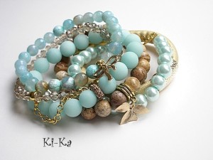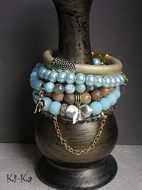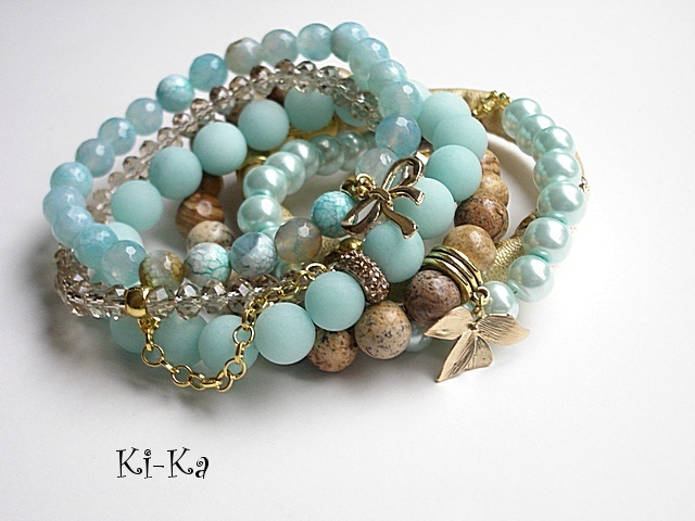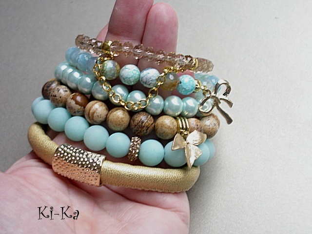 Komplet sześciu bransoletek wykonanych z naturalnych minerałów: jaspisów [10mm], jadeitów matowych [10mm], fasetowanych agatów [8mm], fasetowanych szklanych kryształków, szklanych pereł , rzemienia z ekologicznej skórki oraz elementów metalowych w złotym kolorze. Bransoletki pasują na nadgarstek 15,5 - 16,5cm. Biżuteria ozdobnie zapakowana.