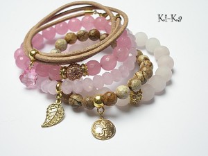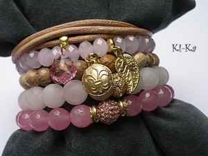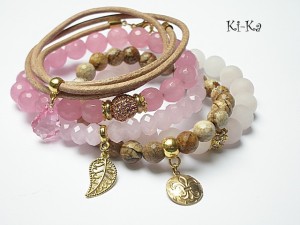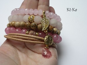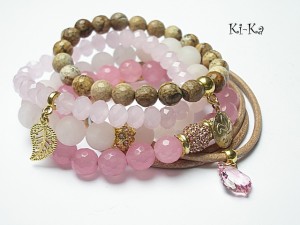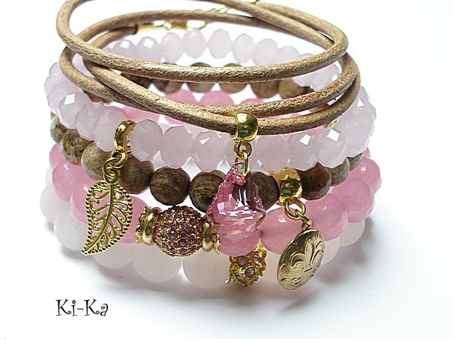Komplet pięciu bransoletek wykonanych z naturalnych minerałów: jaspisów [8mm], kuleczek jadeitów [matowe i gloss 10mm], fasetowanych szklanych kryształków, rzemienia z naturalnej skórki, przekładki wysadzanej kryształkami, ekskluzywnej przekładki wysadzanej cyrkoniami, kryształka Swarovskiego w kształcie kropli barokowej oraz elementów metalowych w złotym kolorze. Bransoletki pasują na nadgarstek 15 - 16,5cm. Biżuteria ozdobnie zapakowana.