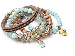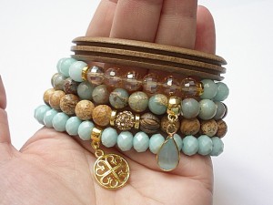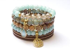 Komplet pięciu bransoletek wykonanych z naturalnych minerałów: jaspis krajobrazowy [8mm], jaspis impresja [8mm], jadeitów fasetowanych [8mm], fasetowanych szklanych kryształków [8 x 6mm i 8mm] , przywieszki z uleksytem, rzemienia z naturalnej skórki, przekładki shamballa wysadzanej kryształkami Swarovskiego oraz elementów metalowych w złotym kolorze. Bransoletki pasują na nadgarstek 15,5 - 16,5cm. Biżuteria ozdobnie zapakowana.