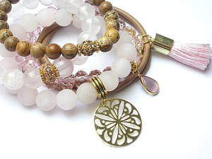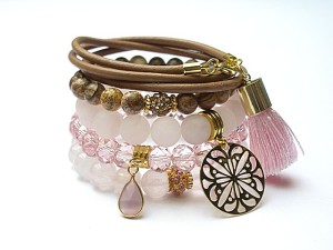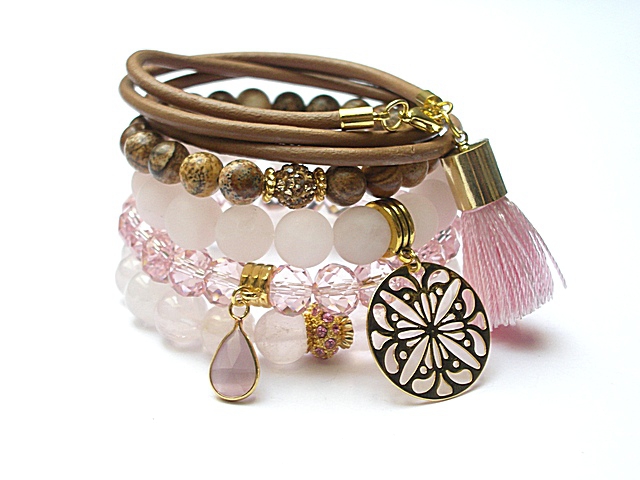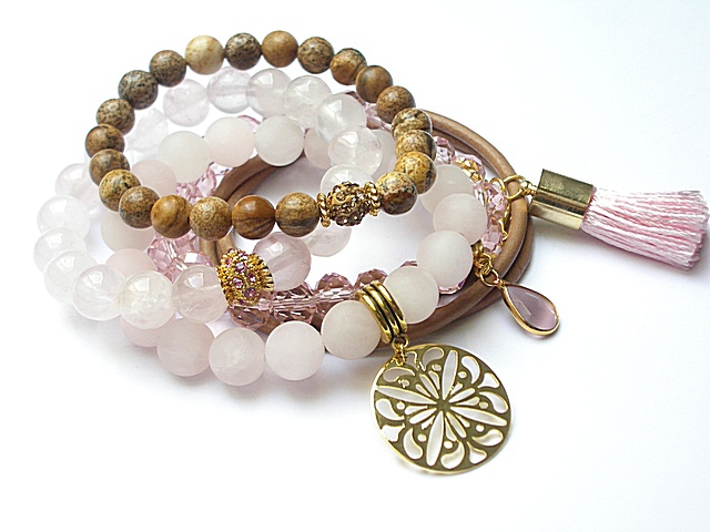 Komplet pięciu bransoletek wykonanych z naturalnych minerałów: jaspis krajobrazowy [8mm], kwarc [10mm], jadeitów matowych [10mm], fasetowanych szklanych kryształków [8 x 10mm , przywieszki z uleksytem, rzemienia z naturalnej skórki, przekładki shamballa wysadzanej kryształkami Swarovskiego, satynowego chwostu oraz elementów metalowych w złotym kolorze. Bransoletki pasują na nadgarstek 15,5 - 16,5cm. Biżuteria ozdobnie zapakowana.