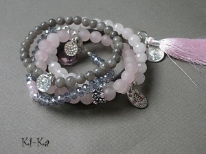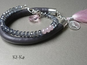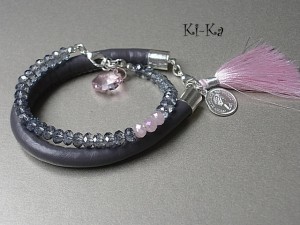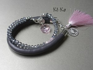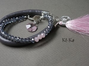 Komplet dwóch bransoletek wykonanych z ekologicznego rzemienia, kryształka Swarovskiego, satynowego chwostu, kryształków [szkło bardzo dobrej jakości] oraz elementów w kolorze srebra. Pasują na nadgarstek 15- 16,5cm. Biżuteria ozdobnie zapakowana. Bransoletki można zestawić z innymi modelami dostępnymi w naszej galerii - przykładowe zdjęcia.