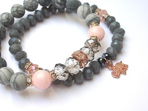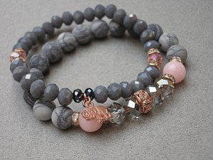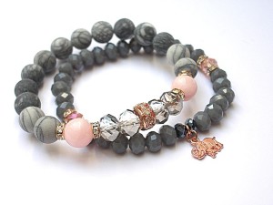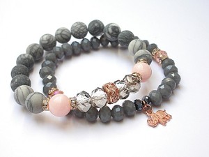 Komplet dwóch bransoletek wykonanych z naturalnych kamieni - matowy jaspis [10mm], jadeity [10mm], kryształków fasetowanych [6 x 8mm; 8 x 10mm oraz 4 x 6mm], przekładki wysadzanej kryształkami oraz elementów metalowych w kolorze tzw. różowego złota. Bransoletki pasują na nadgarstek 16-17cm . Biżuteria ozdobnie zapakowana. Możliwość dopasowania bransoletek do nadgarstka - wcześniej prosimy o kontakt.