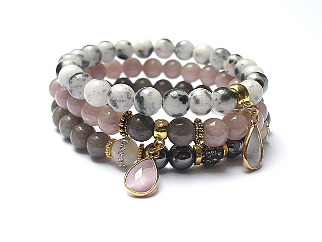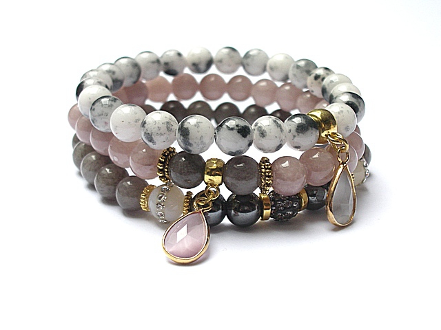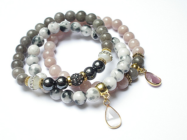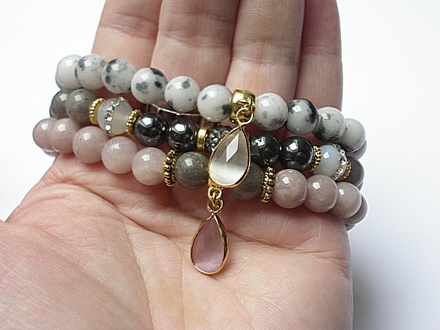 Komplet trzech bransoletek wykonanych z naturalnych kamieni - jadeity [8mm], marmur [8mm], agatów wysadzanych cyrkoniami [8mm], hematytów [8mm], efektownych zawieszek z uleksytu, kuleczki shamballa wysadzanej kryształkami Swarovskiego oraz elementów metalowych w kolorze złota. Pasują na nadgarstek 16-17cm . Biżuteria ozdobnie zapakowana