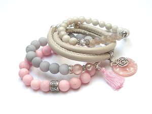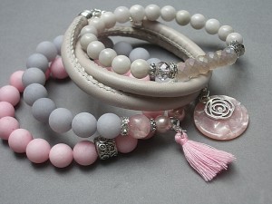 Komplet czterech bransoletek wykonanych z naturalnych kamieni: matowe jadeity [10mm], marmur [10mm], jaspis [8mm], perły Majorka [8mm], kryształki [8mm], zawieszki z żywicy, rzemienia z eco skórki [śr. 5mm], chwosta oraz elementów metalowych w kolorze srebrnym. Bransoletki pasują na nadgarstek 16 - 16,5cm. Biżuteria ozdobnie zapakowana