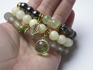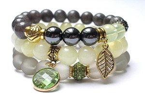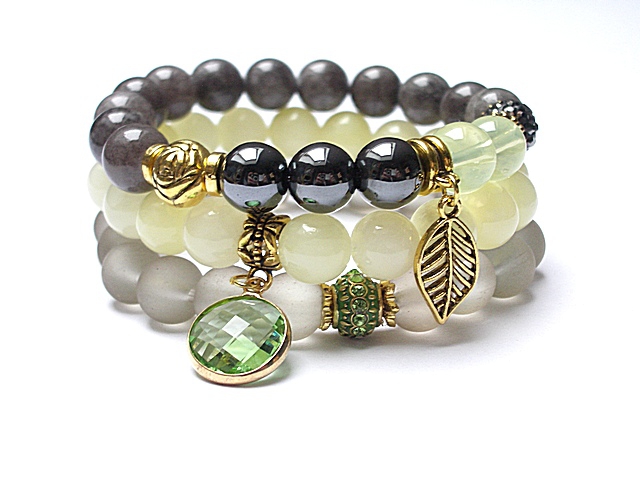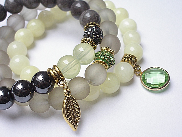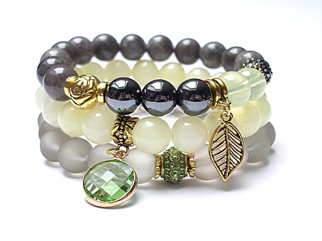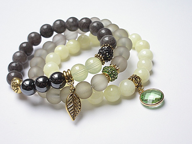 PROJEKT AUTORSKI. WSZELKIE INNE PODOBNE MODELE TO KOPIE NARUSZAJĄCE PRAWA AUTORSKIE. Komplet trzech bransoletek wykonanych z naturalnych kamieni - marmuru [10 mm], jadeitów [10mm], szkła matowego [10mm], szkła opalizującego [10mm], przekładki shamballa wysadzanej kryształkami Swarovskiego, efektownej przywieszki ze szkła oraz elementów metalowych w kolorze złota. Pasują na nadgarstek 16 - 17cm . Biżuteria ozdobnie zapakowana.