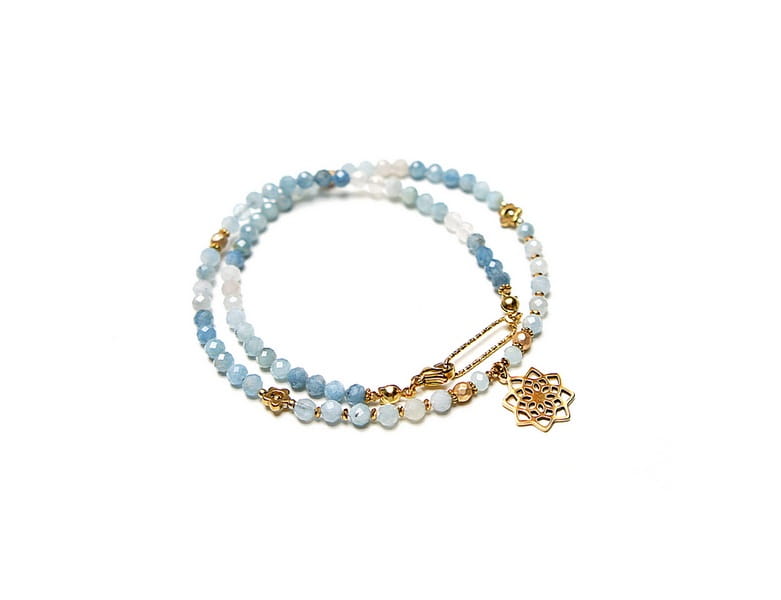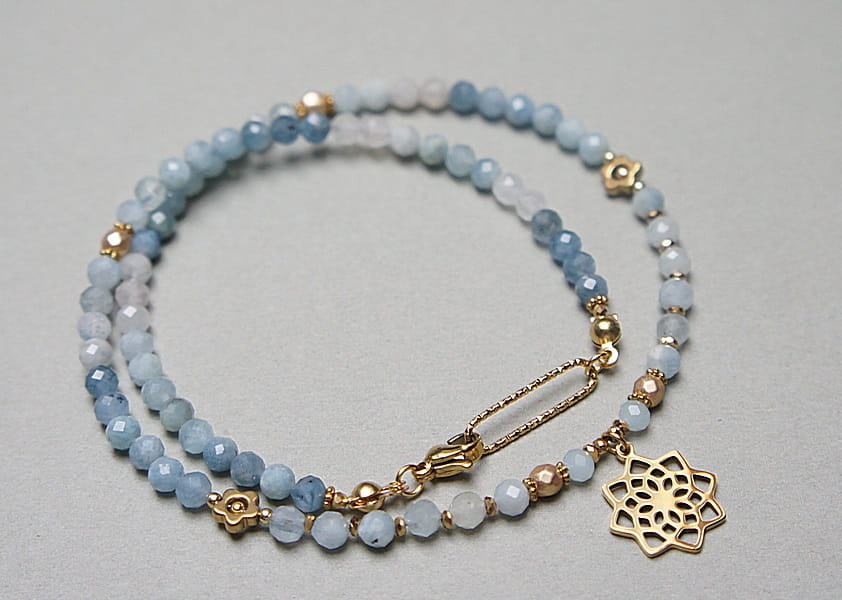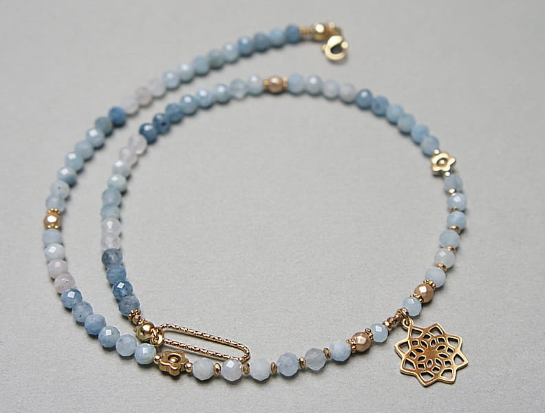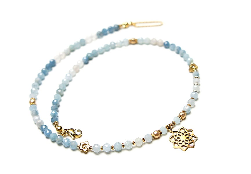Krótki, delikatny naszyjnik wykonany w całości z pozłacanej stali szlachetnej oraz naturalnych, szlachetnych kamieni - fasetowany akwamaryn [4mm], przekładek z hematytu [1mm, 4mm oraz 6mm - kwiatki]. Naszyjnik o długości ok. 42,5cm. Biżuteria ozdobnie zapakowana.