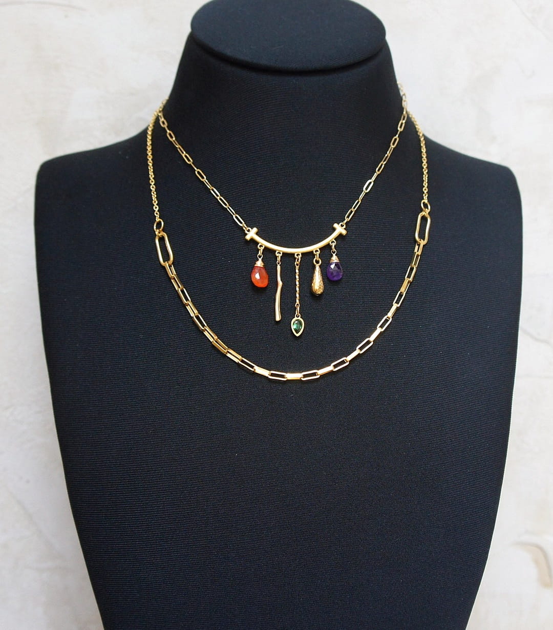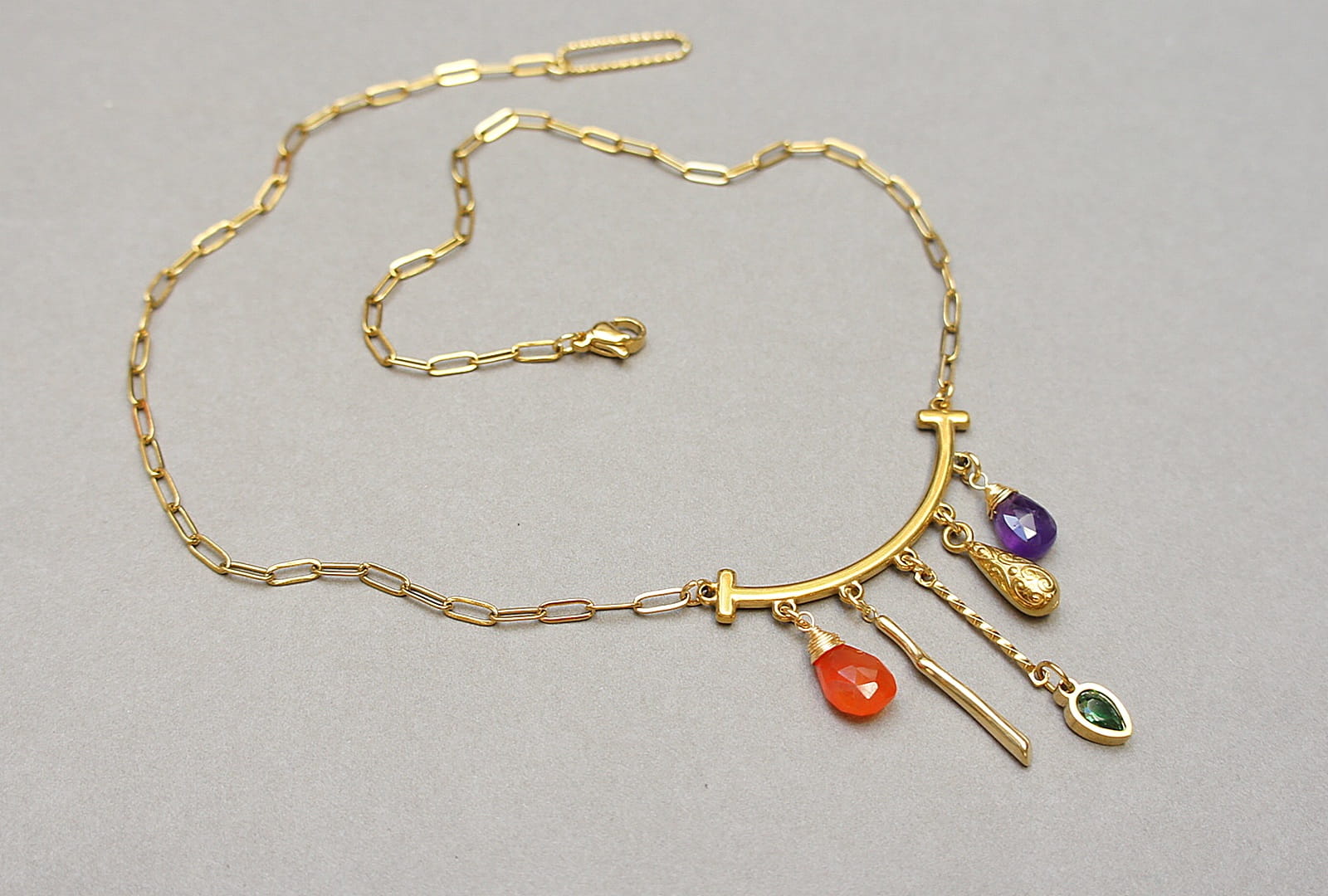 Naszyjnik wykonany w całości ze stali szlachetnej w połączeniu z naturalnym ametystem, karneolem, cyrkonią w oprawie. Całkowita długość naszyjnika ok. 43 cm.