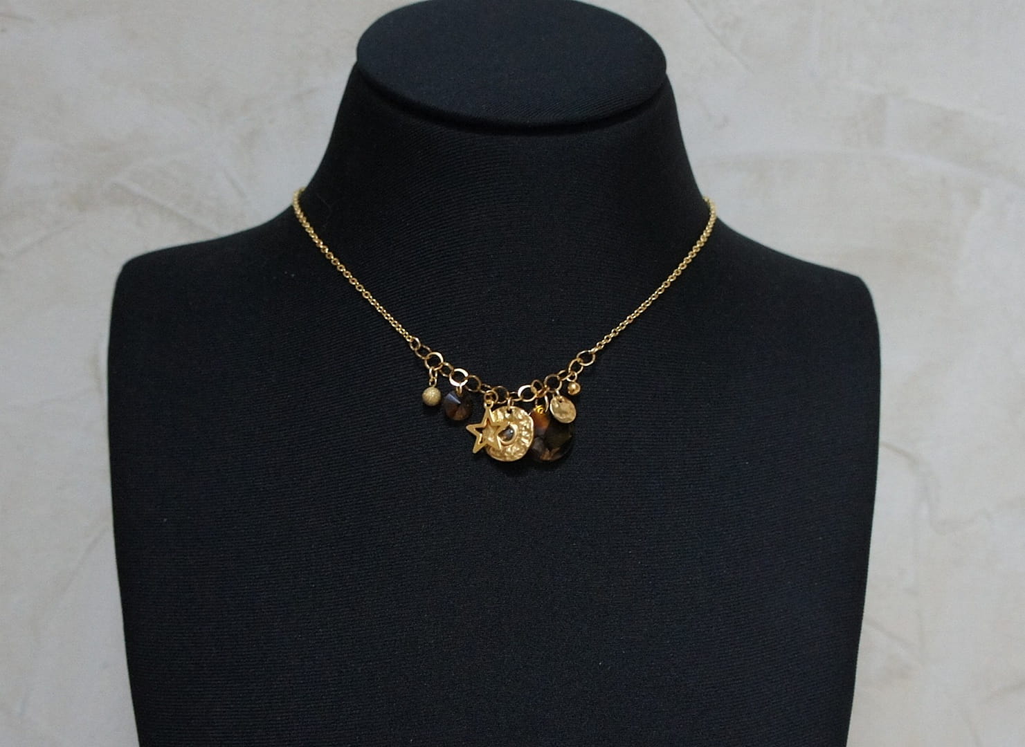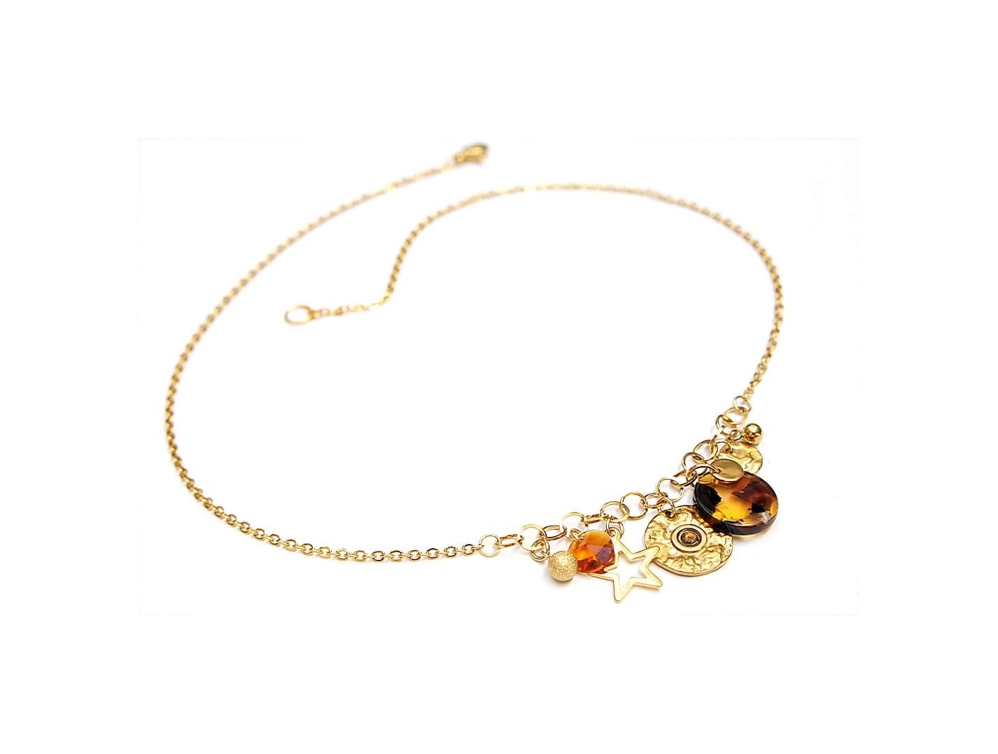 Krótki naszyjnik wykonany w całości ze stali szlachetnej pozłacanej w połączeniu z monetką żywicy [10mm], kryształkiem rivolii [8mm], kryształkiem Swarovski oraz zawieszkami. Całkowita długość naszyjnika ok. 43cm. Biżuteria ozdobnie zapakowana.