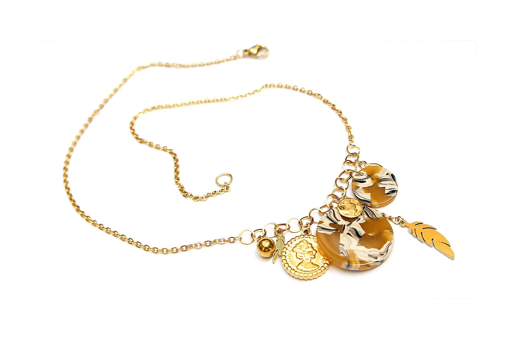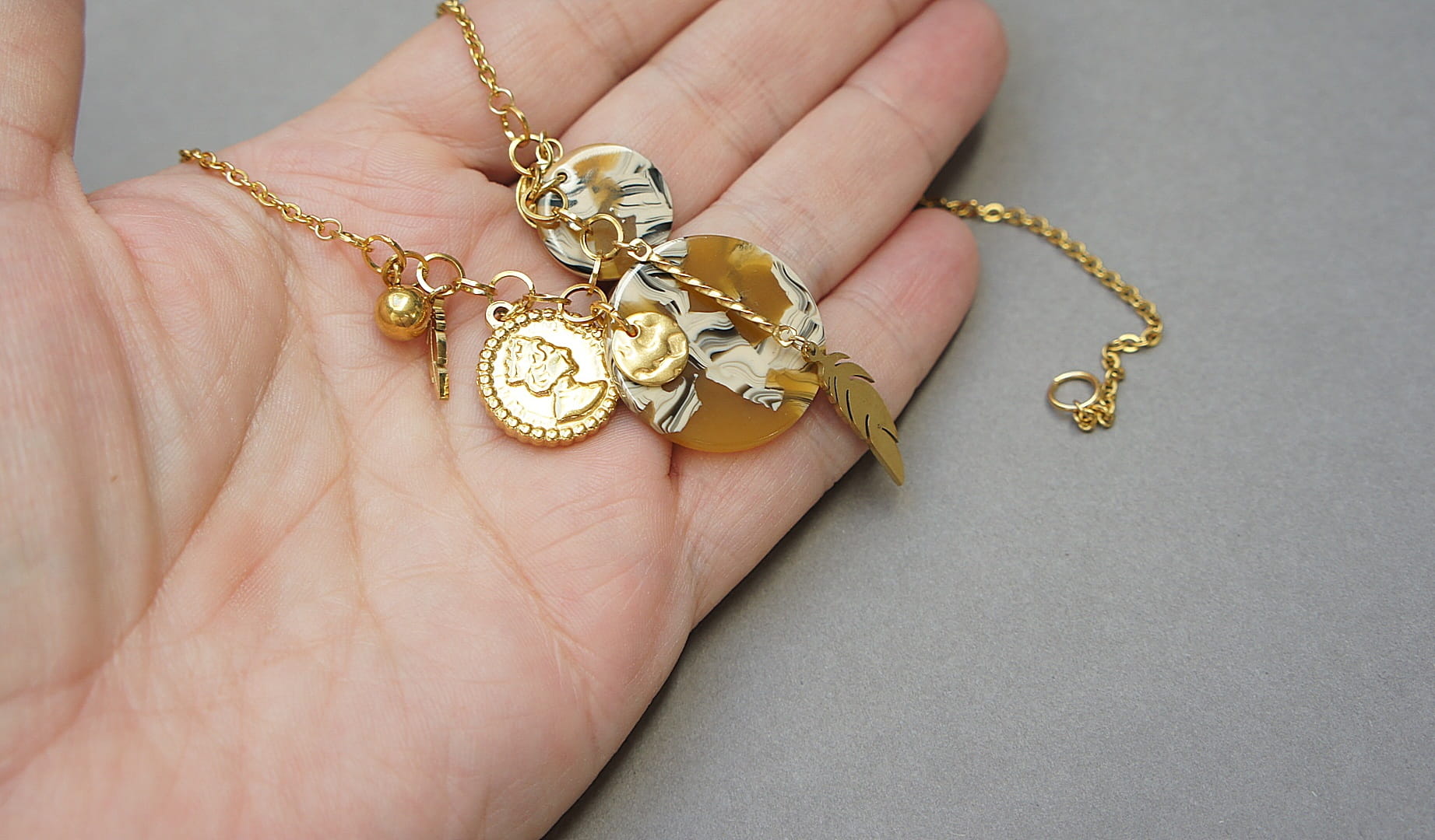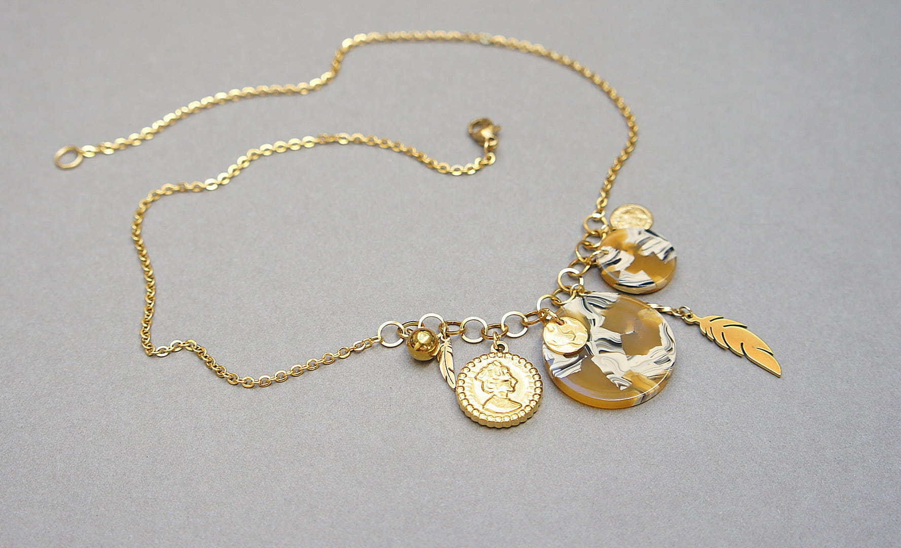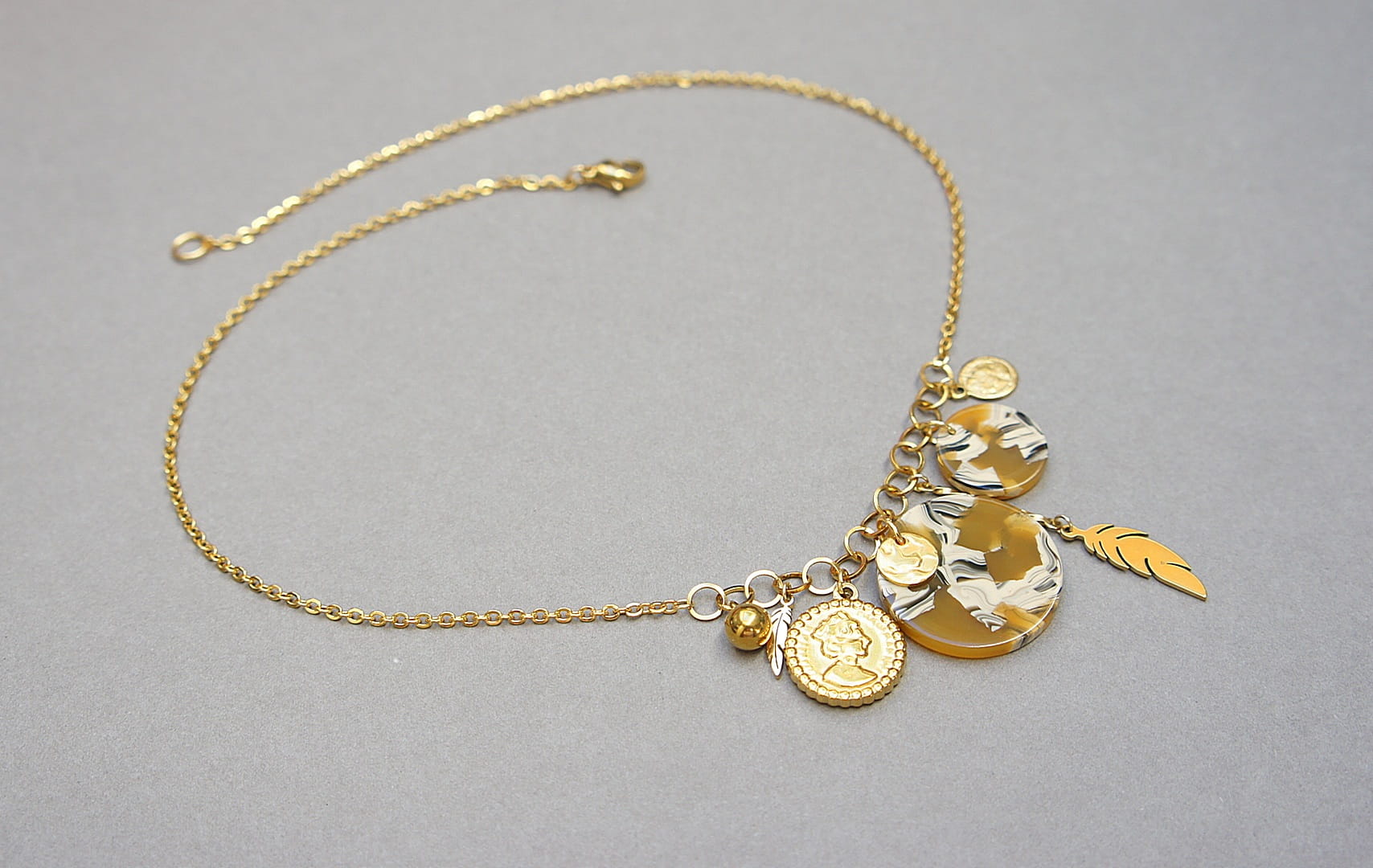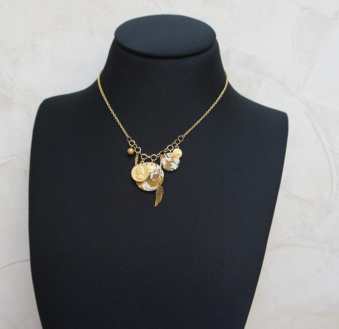 Krótki naszyjnik wykonany w całości ze stali szlachetnej pozłacanej w połączeniu z monetką żywicy [16mm i 24mm] oraz zawieszkami. Całkowita długość naszyjnika ok. 42,5cm. Biżuteria ozdobnie zapakowana.