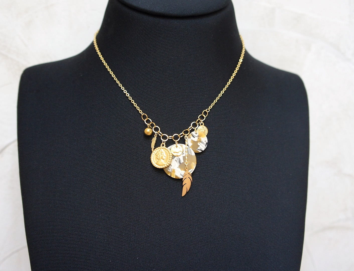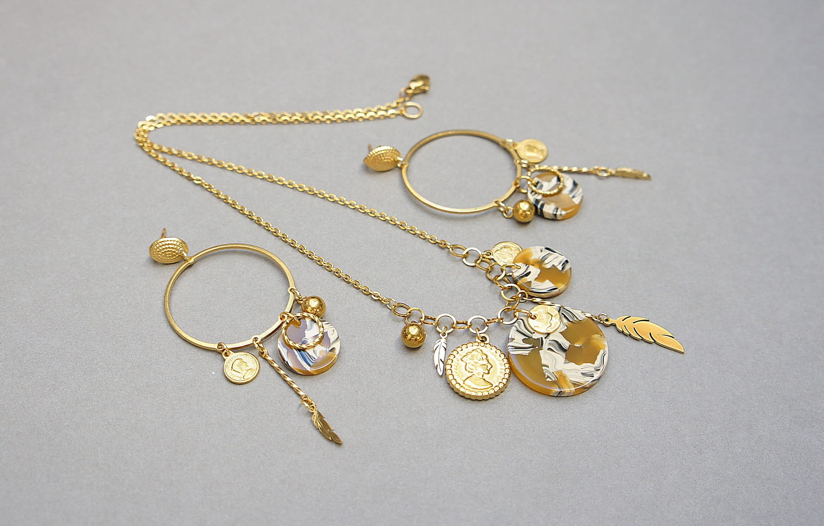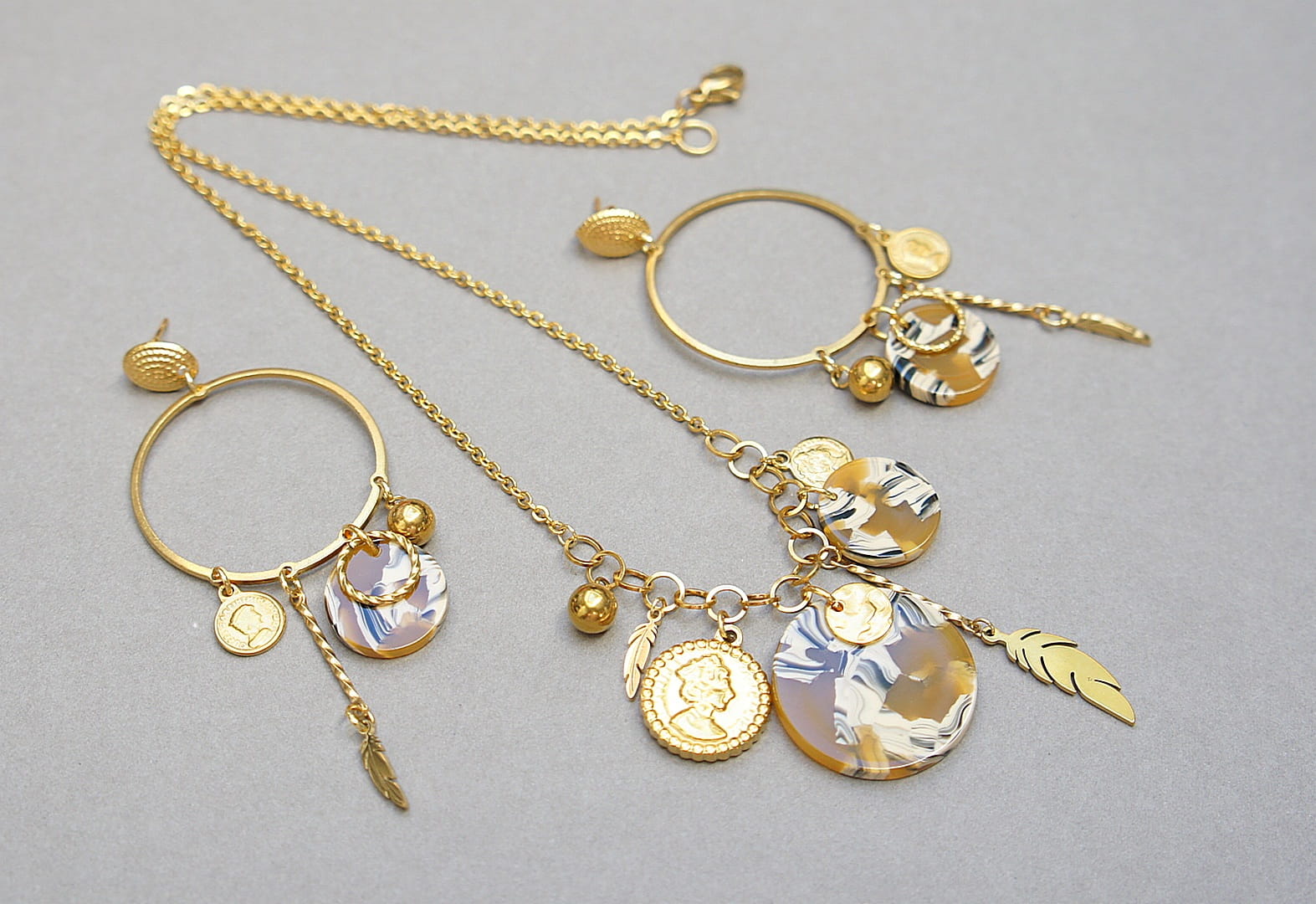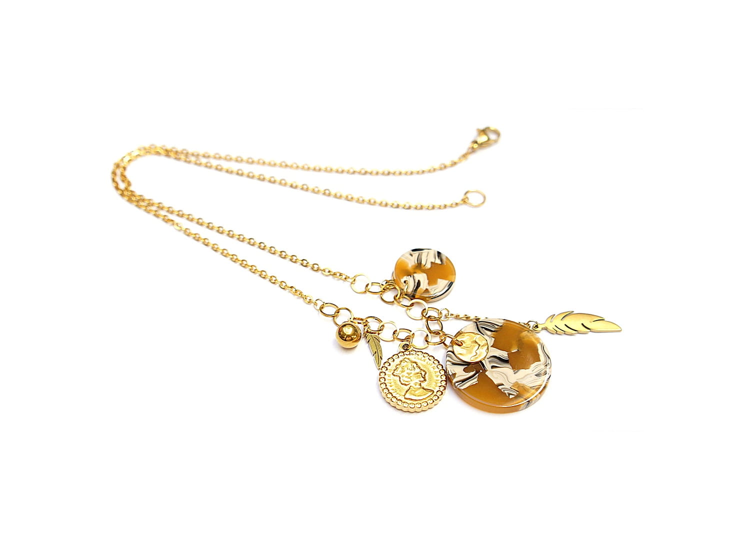 Krótki naszyjnik wykonany w całości ze stali szlachetnej pozłacanej w połączeniu z monetką żywicy [16mm i 24mm] oraz zawieszkami. Całkowita długość naszyjnika ok. 42,5cm. Biżuteria ozdobnie zapakowana.