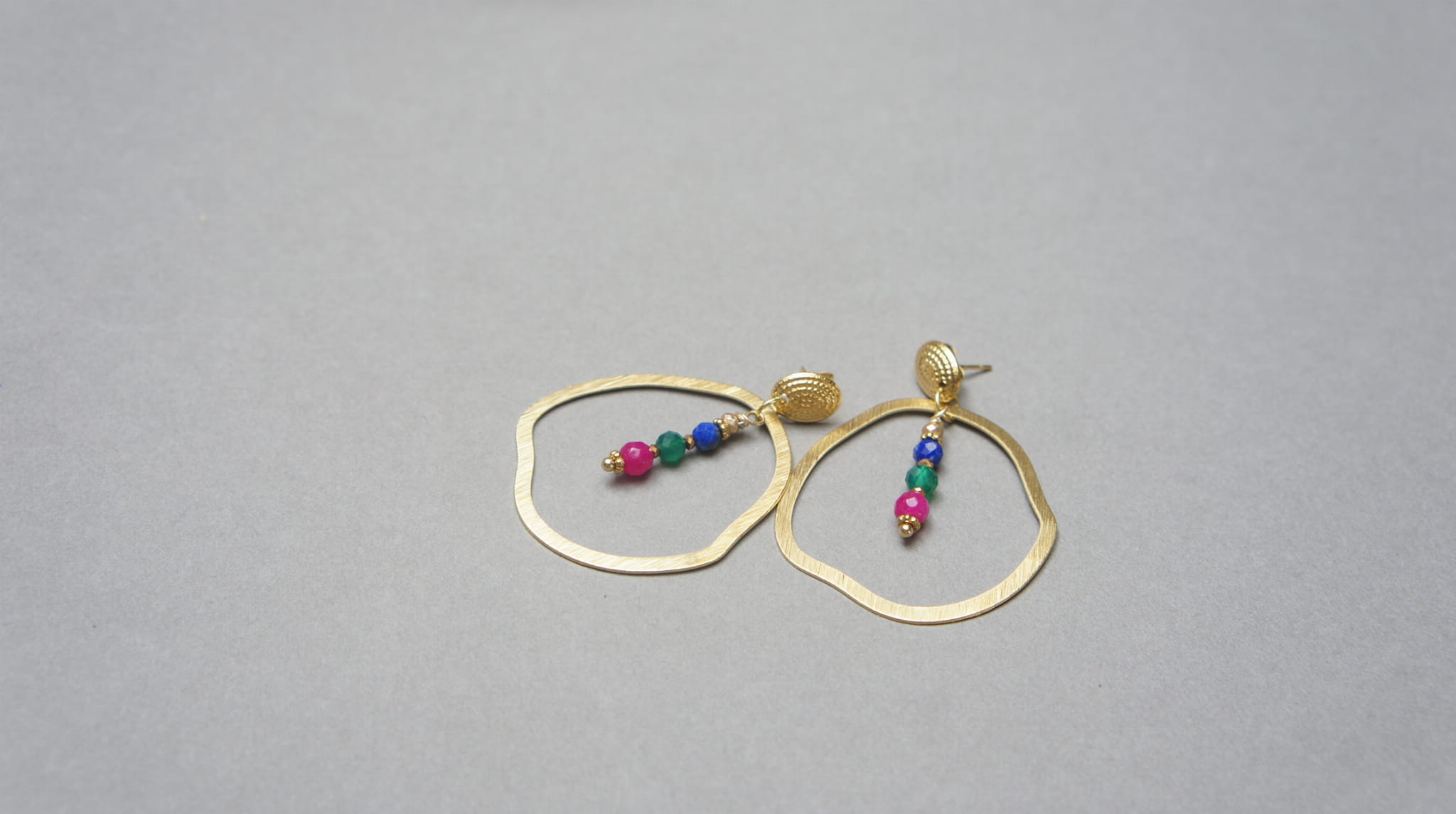 Duże kolczyki wykonane z pozłacanej stali szlachetnej, mosiądzu platerowanego i naturalnych kamieni: lapis lazuli, onyks zielony, jadeity [4mm]. Długość kolczyków: ok. 4,7cm.