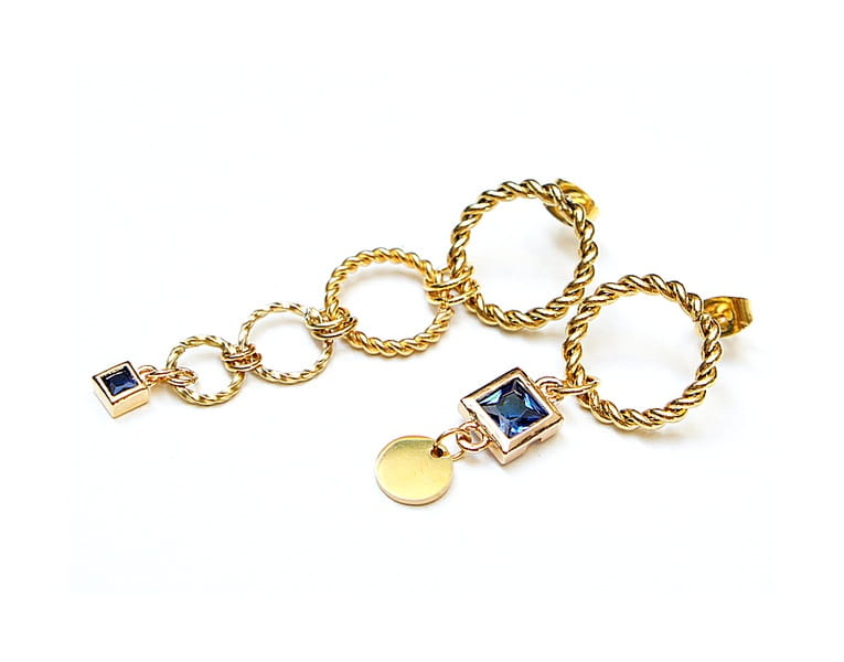 Asymetryczne kolczyki wykonane z pozłacanej stali szlachetnej i mosiądzu. Cyrkonie w okuciu. Długość kolczyków: ok. 3cm i 5cm. Biżuteria ozdobnie zapakowana. Cyrkonie w kolorze niebieskim.