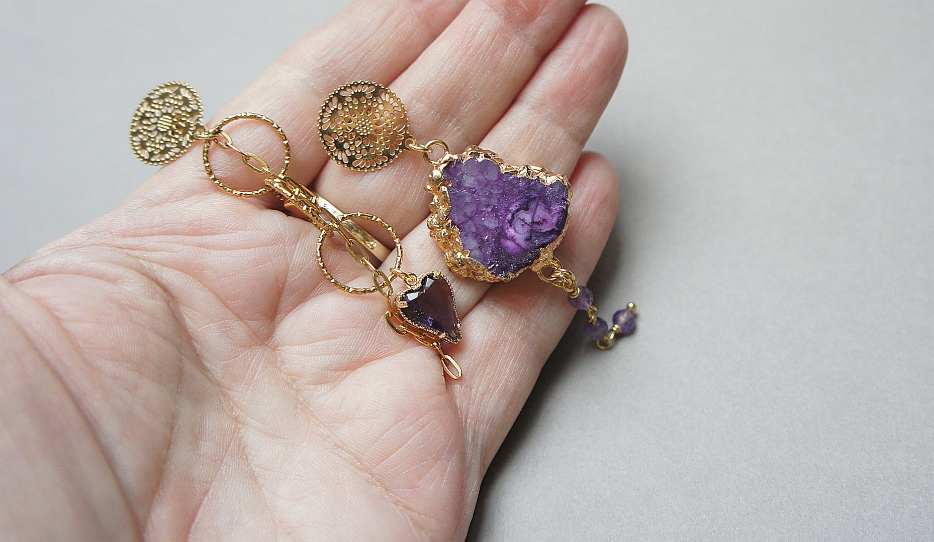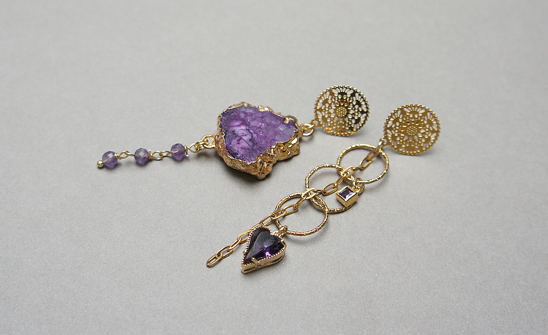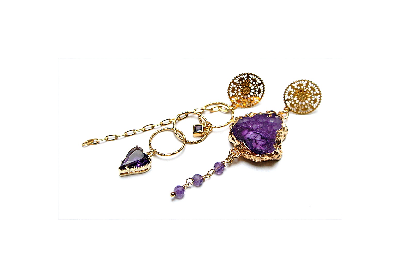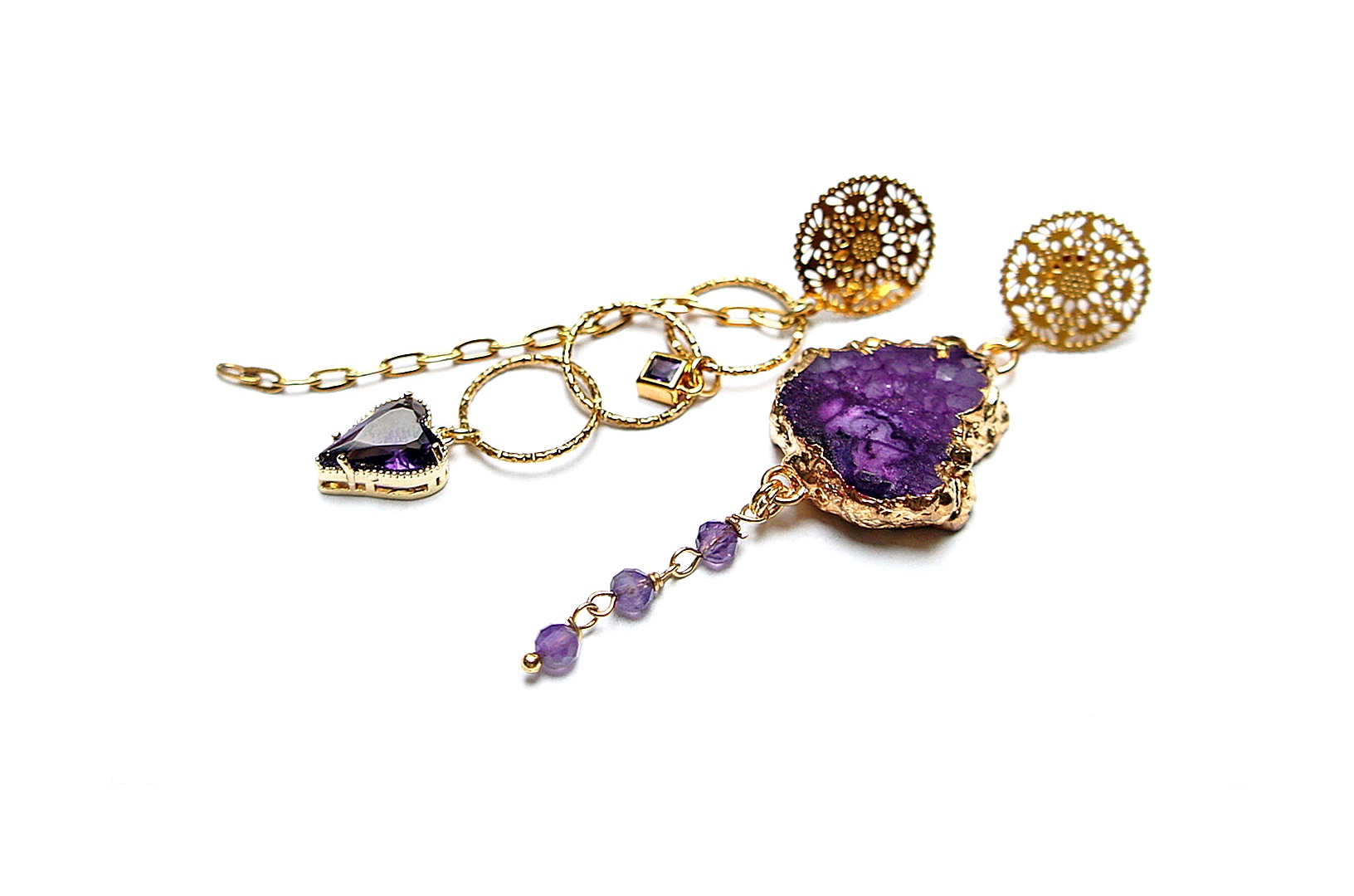 Asymetryczne kolczyki wykonane z pozłacanej stali szlachetnej, druzy agatu, ametystów fasetowanych, zawieszek z cyrkoniami w okuciu. Sztyfty ze stali szlachetnej. Długość kolczyków: ok. 8 i 7,5cm. Biżuteria ozdobnie zapakowana.