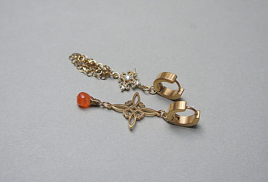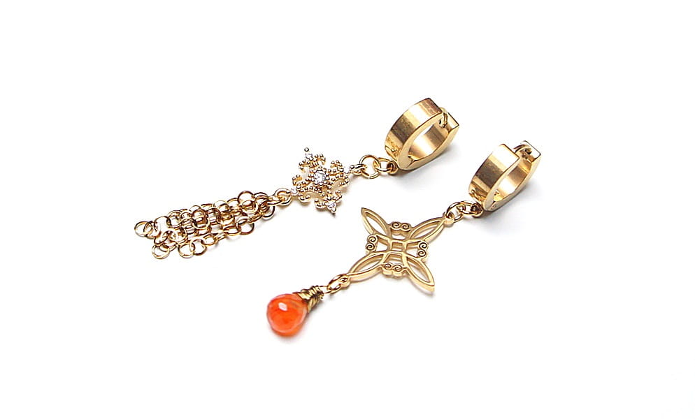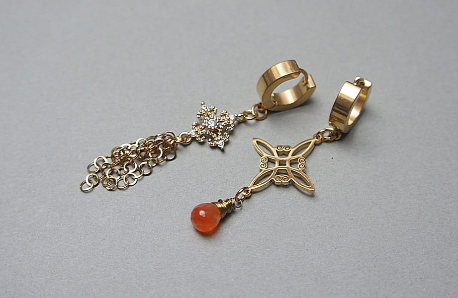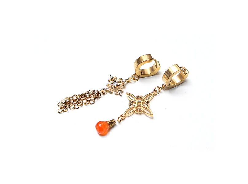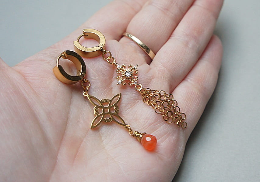 Asymetryczne kolczyki wykonane z pozłacanej stali szlachetnej, mosiądzu, karneolu. Długość kolczyków: ok. 4 i 5cm. Biżuteria ozdobnie zapakowana.