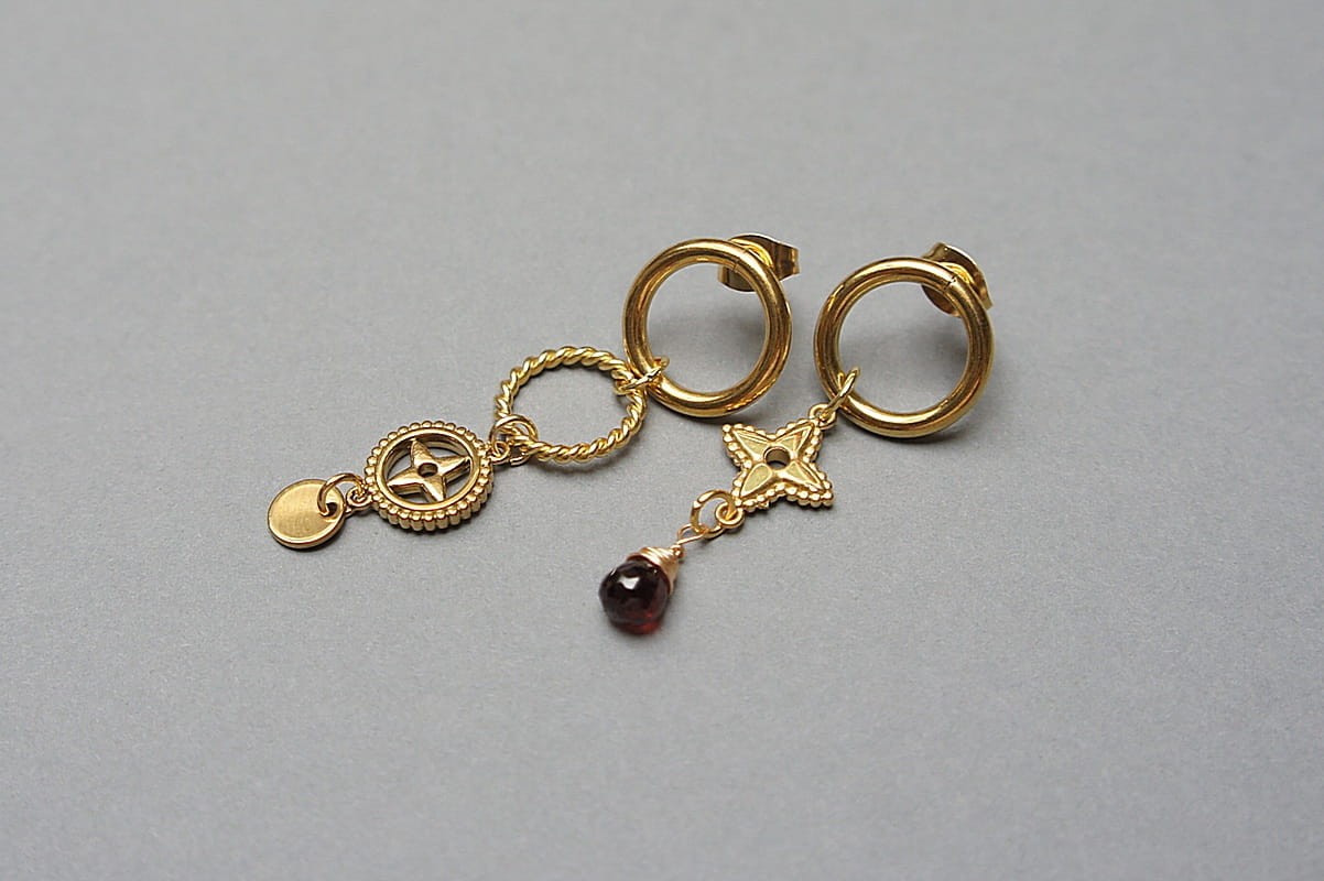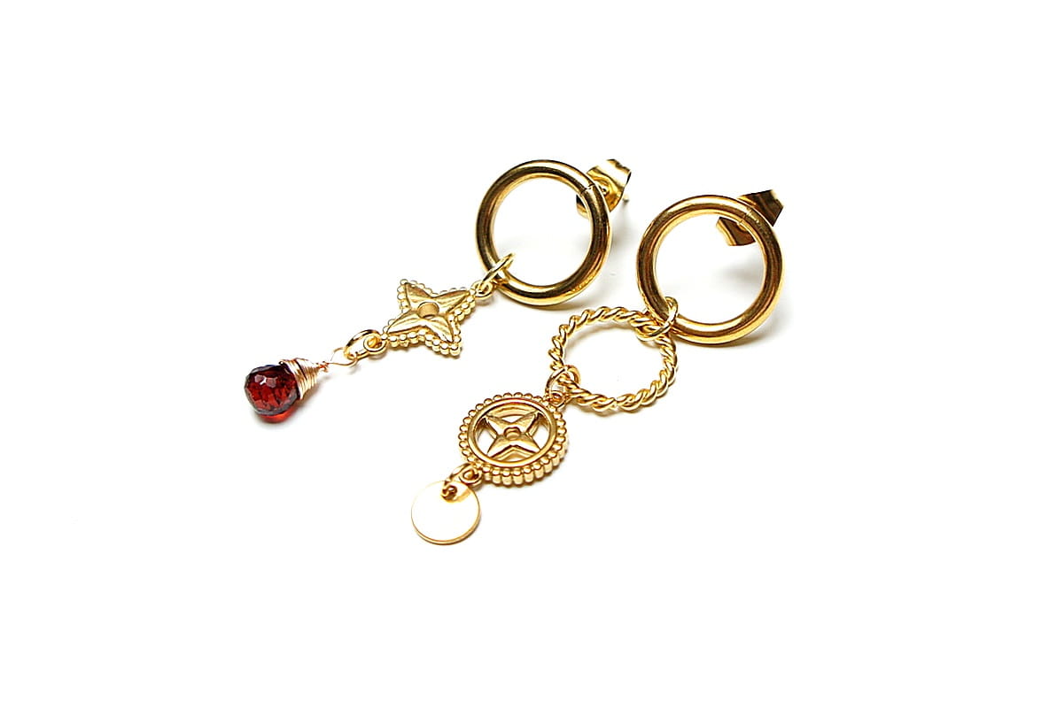 Asymetryczne kolczyki wykonane z pozłacanej stali szlachetnej oraz brioletki naturalnego granatu. Długość kolczyków: ok. 4,1 i 4,8cm. Biżuteria ozdobnie zapakowana.