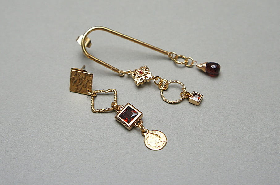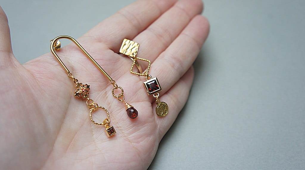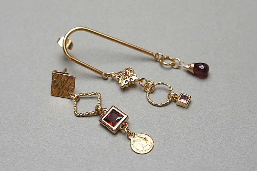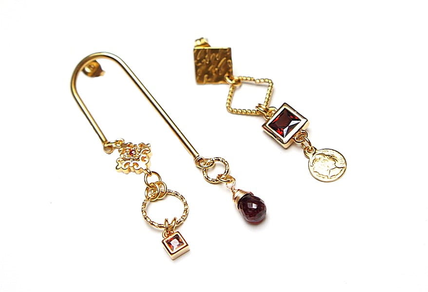 Asymetryczne kolczyki wykonane z pozłacanej stali szlachetnej i mosiądzu platerowanego. Cyrkonie z mosiądzu w okuciu; naturalny granat w kształcie brioletki fasetowanej. Długość kolczyków: ok. 6 i 7cm. Sztyfty ze stali szlachetnej - nieuczulające.