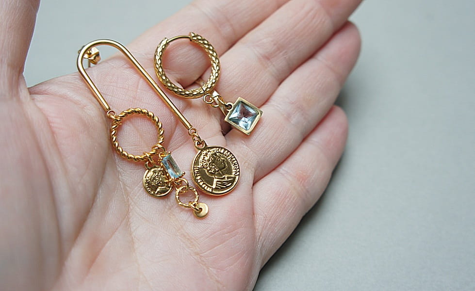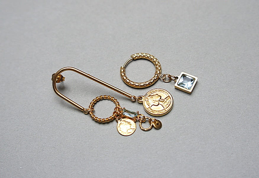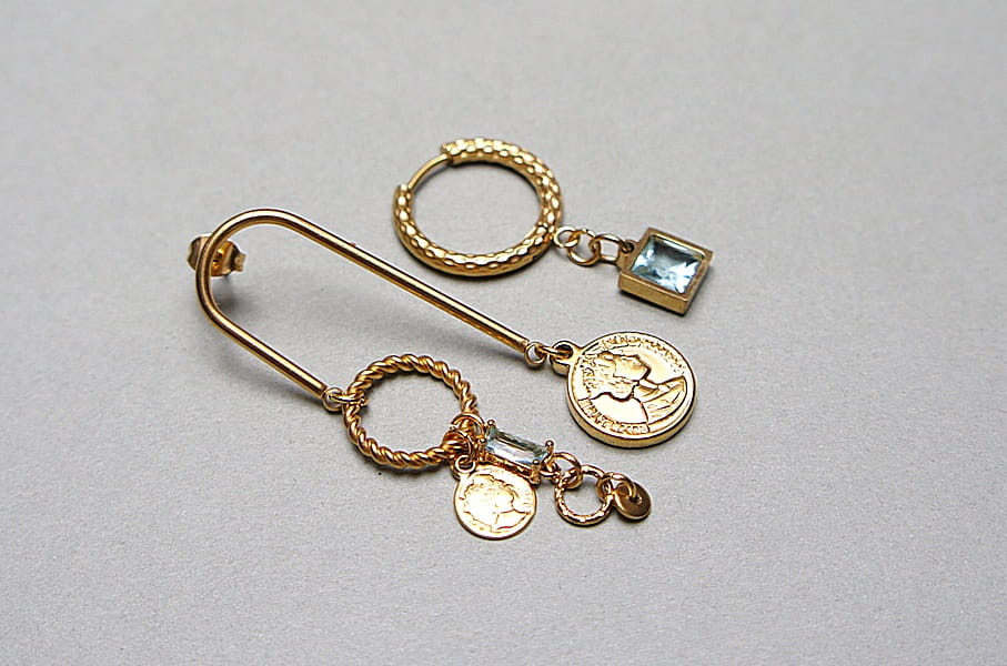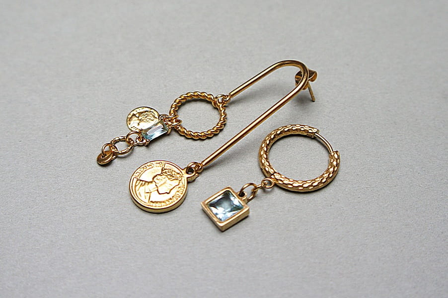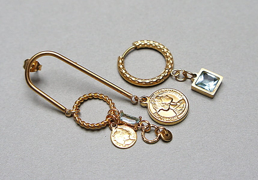 Asymetryczne kolczyki wykonane z pozłacanej stali szlachetnej i mosiądzu. Cyrkonie z mosiądzu w okuciu. Długość kolczyków: ok. 5,5cm i 3,6cm. Biżuteria ozdobnie zapakowana.