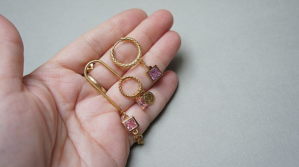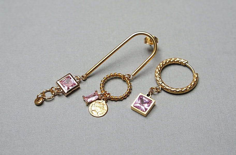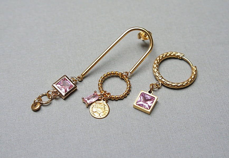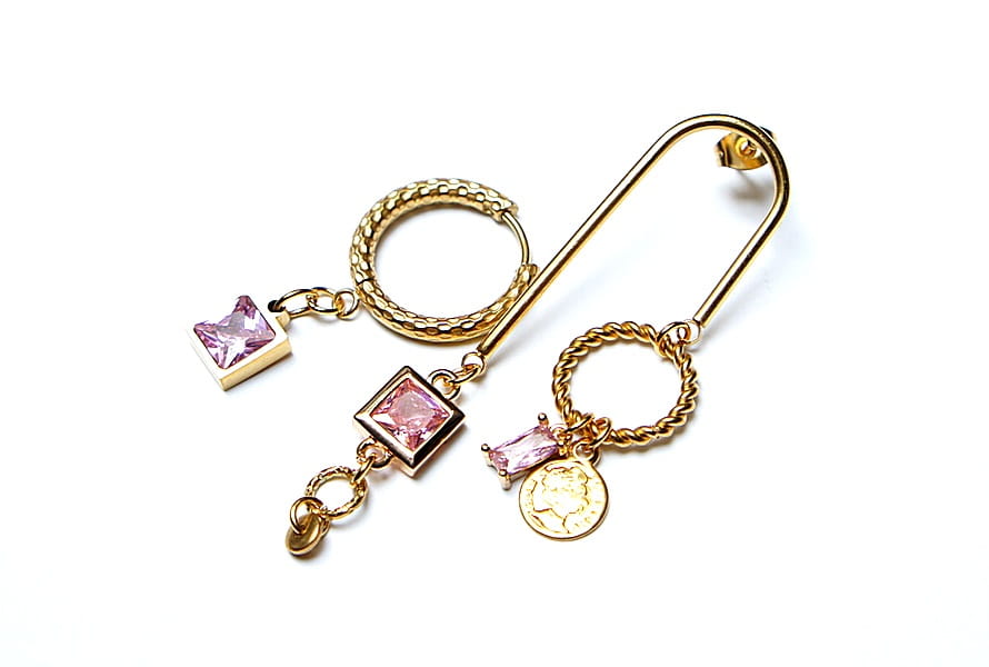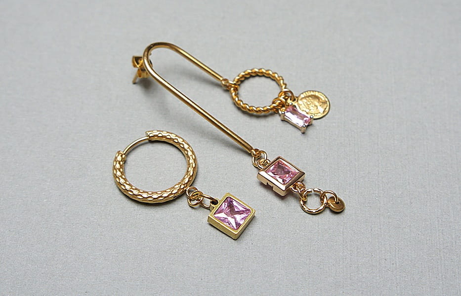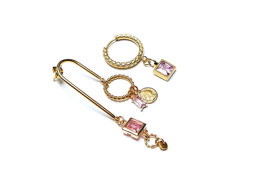 Asymetryczne kolczyki wykonane z pozłacanej stali szlachetnej i mosiądzu. Cyrkonie w okuciu ze stali szlachetnej i z mosiądzu. Długość kolczyków: ok. 6,3cm i 3,6cm. Biżuteria ozdobnie zapakowana.