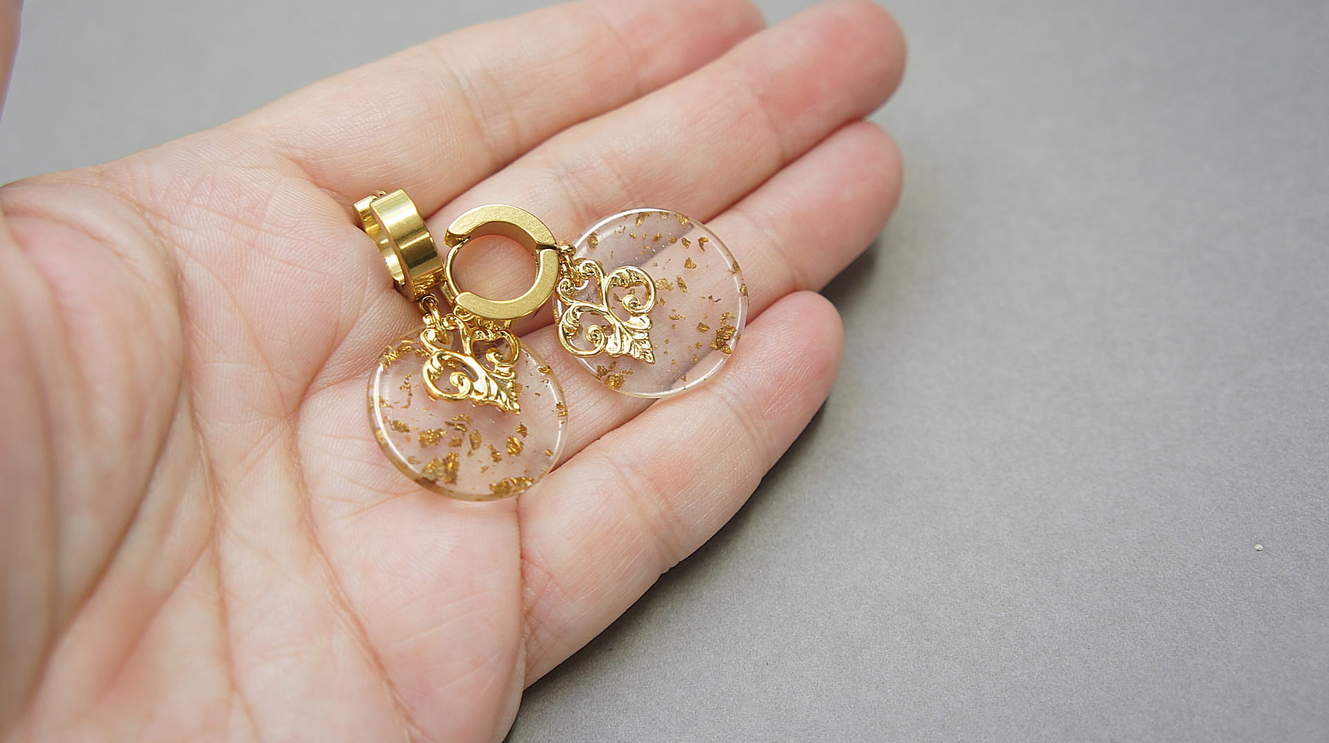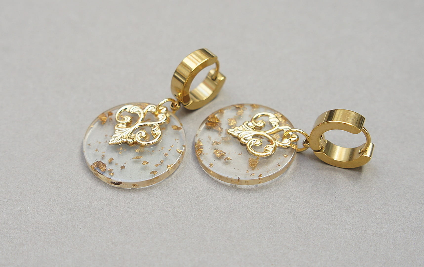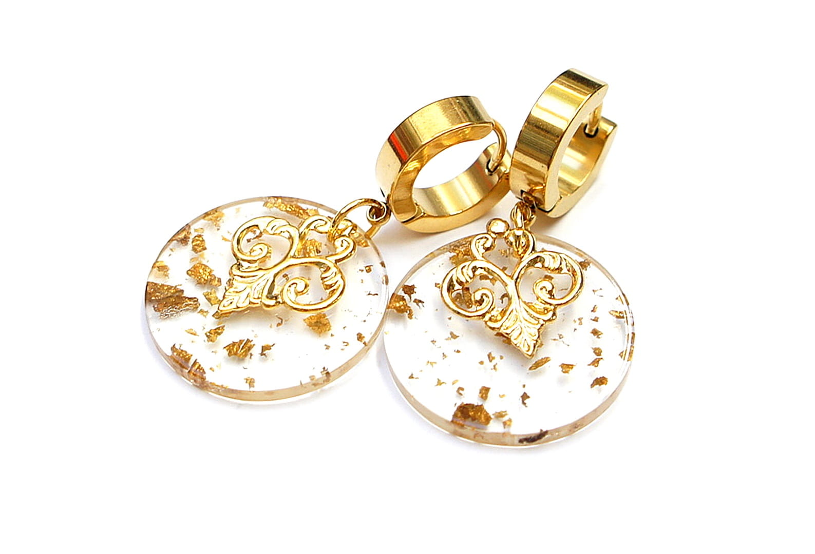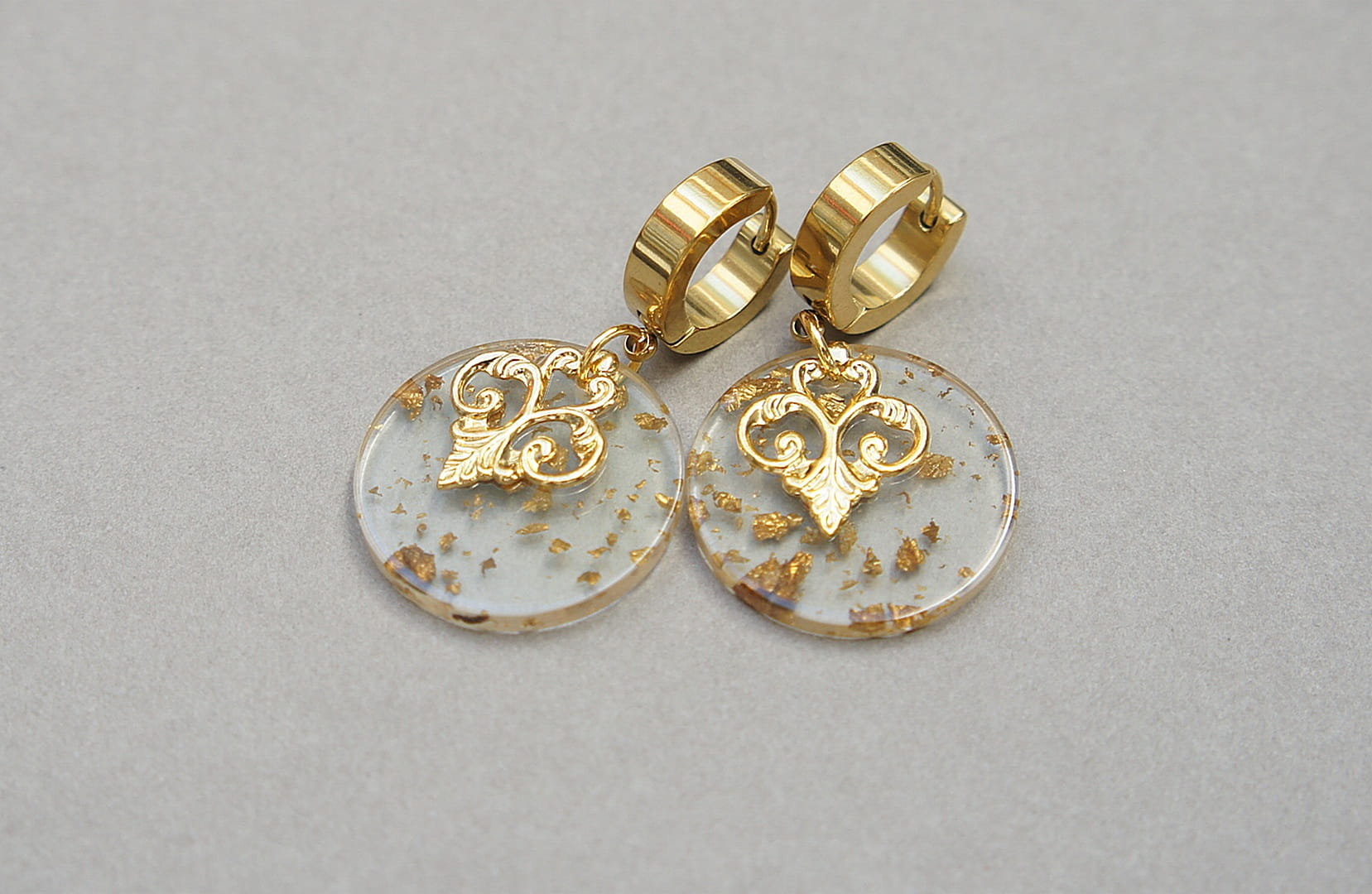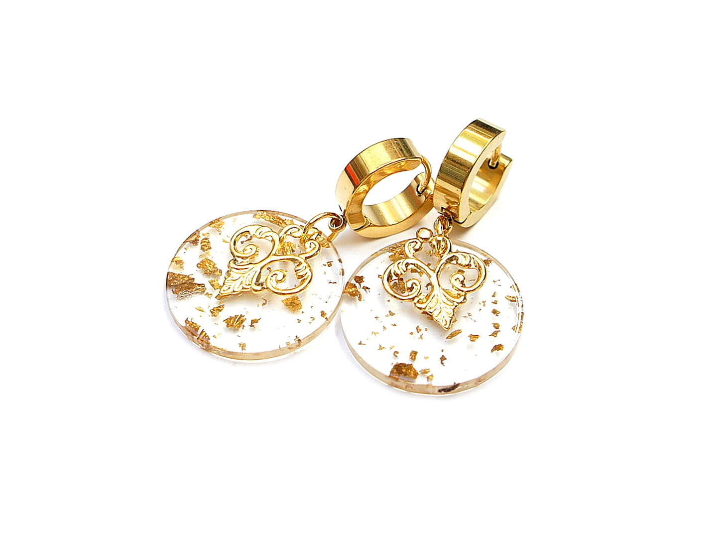 Kolczyki wykonane ze stali szlachetnej pozłacanej oraz monetek z żywicy z zatopionymi w środku złotymi płatkami [22mm]. Długość kolczyków: ok. 3,6cm. Bigle - kajdanki.