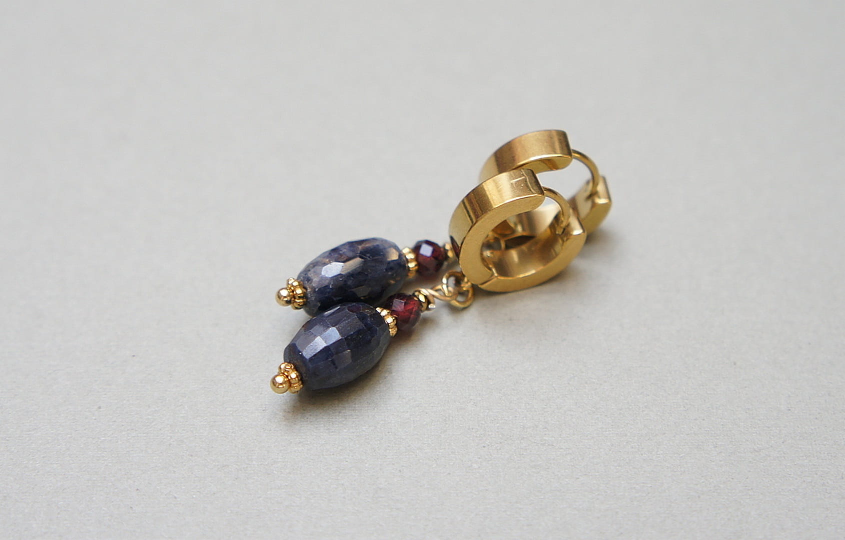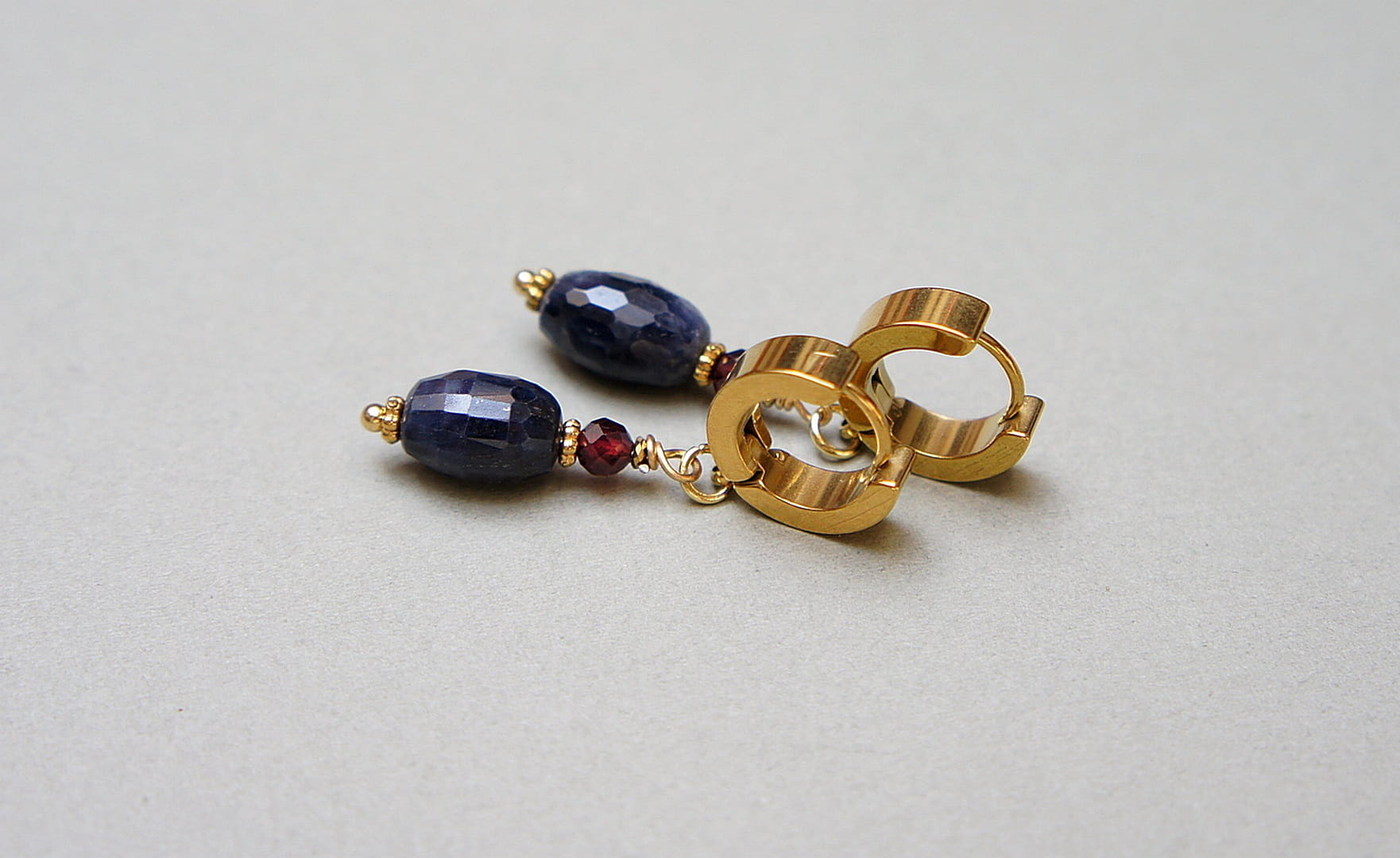 Kolczyki wykonane z naturalnych, szlachetnych kamieni - beczułki fasetowane szafirów [7 x 10mm], fasetowane granaty [4mm] oraz z pozłacanej stali szlachetnej. Długość kolczyków: ok. 4cm. Bigle - kajdanki. Biżuteria ozdobnie zapakowana.