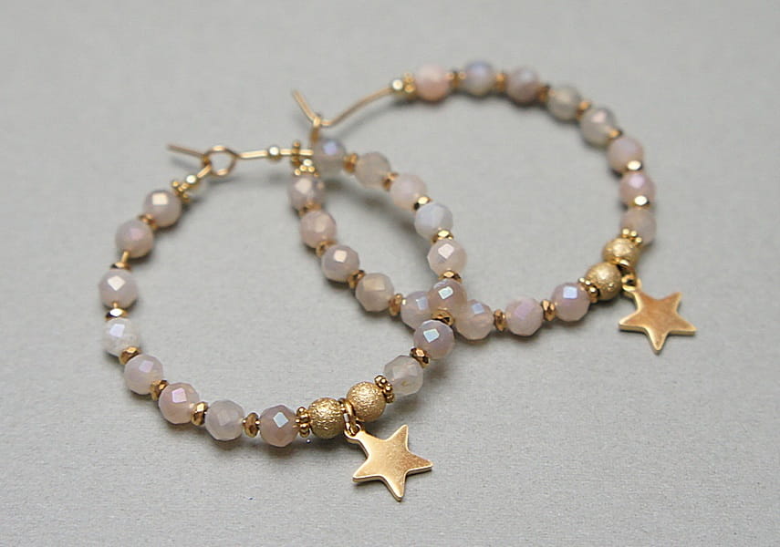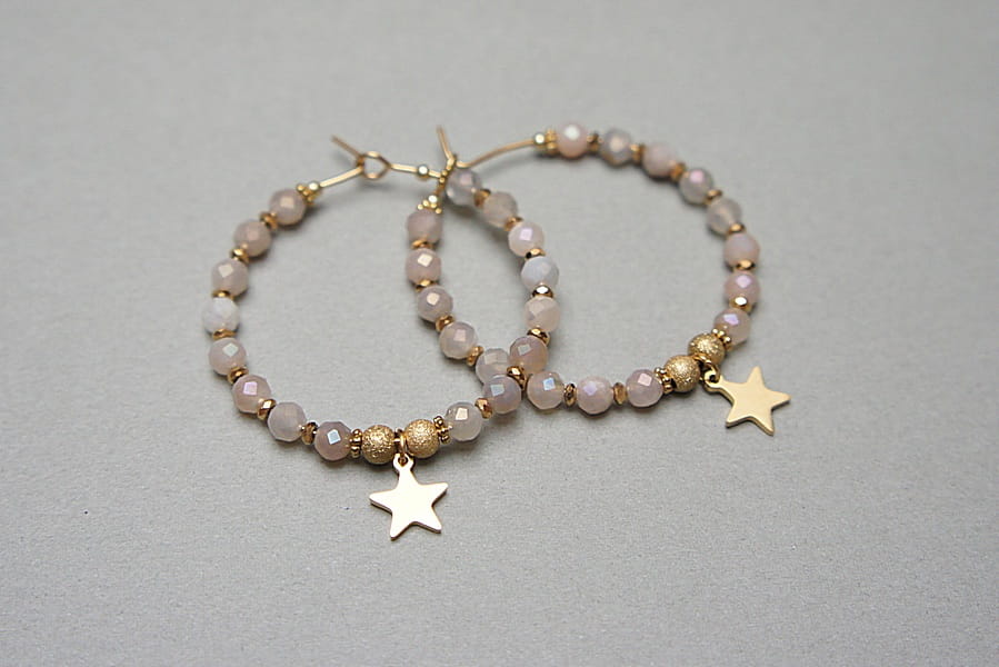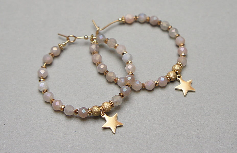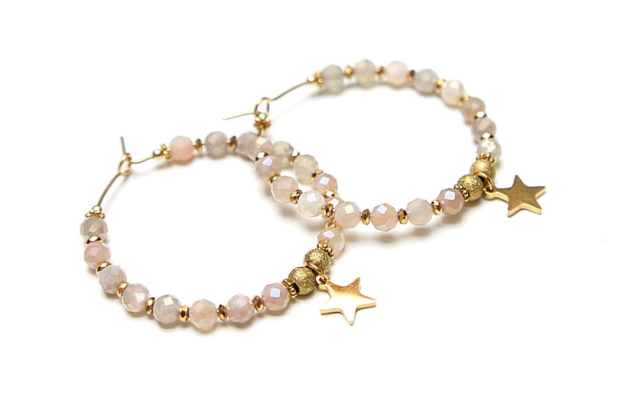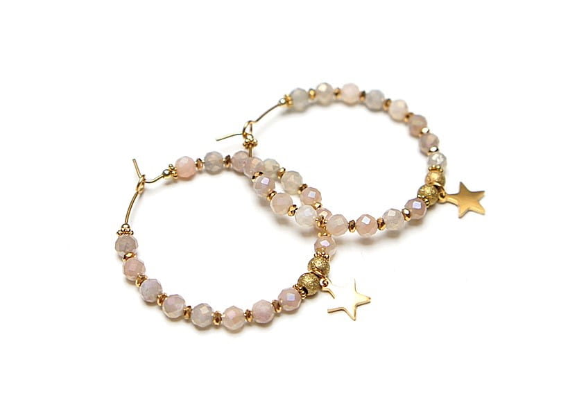 Kolczyki wykonane ze stali szlachetnej pokrytej zlotem, unikatowego kamienia słonecznego z poświatą mystic [4mm], przekładek z hematytu [1mm]. Średnica kół 35mm. Biżuteria ozdobnie zapakowana.